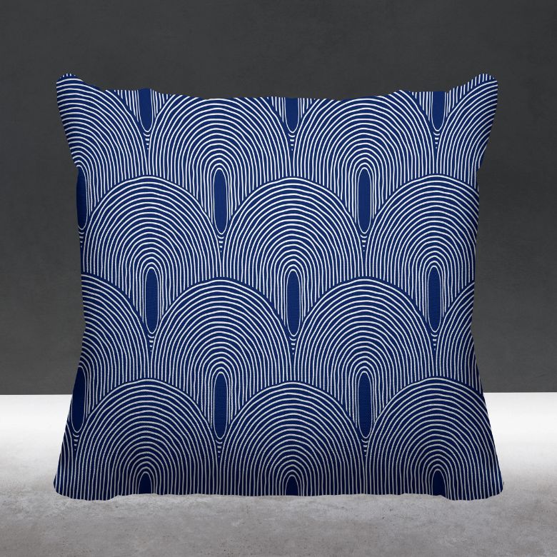 This striped dark blue throw pillow is a classic choice for your outdoor sofa or egg chair.