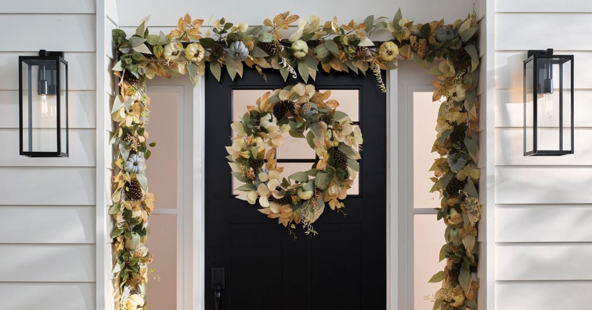 For a cohesive look, a large fall wreath and garland set adds instant curb appeal. This pumpkin patch-inspired option offers a fresh take on autumn hues, with tiny pumpkins and soft pastel shades that would complement a variety of exteriors.