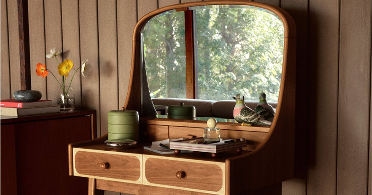 A vanity with an integrated mirror is a great option for several reasons, chief among them the fact that it gives you a place to gaze without taking up precious countertop space that could be used for more products or accessories. This charming mid-century modern-inspired version from the Emma Chamberlain collection at West Elm has a small footprint and thin legs, allowing it to fit within almost any space. The curved mirror and two-tone drawers make it look more like a lucky antique find than a new piece of furniture.