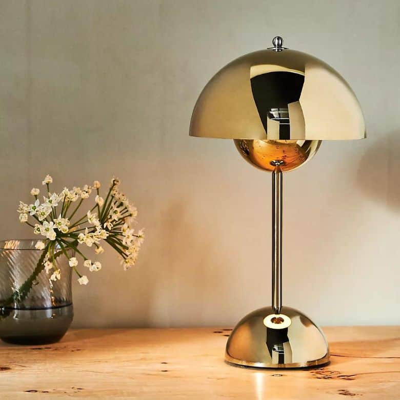 Verner Panton, one of Denmark’s most influential designers, created this metallic masterpiece. It’s best for indoor use only, and will bring effortless style to any room. Made of polycarbonate and steel, the lamp is not only beautiful, but also durable. The metallic domed design is timeless, and the lamp is both rechargeable dimmable.