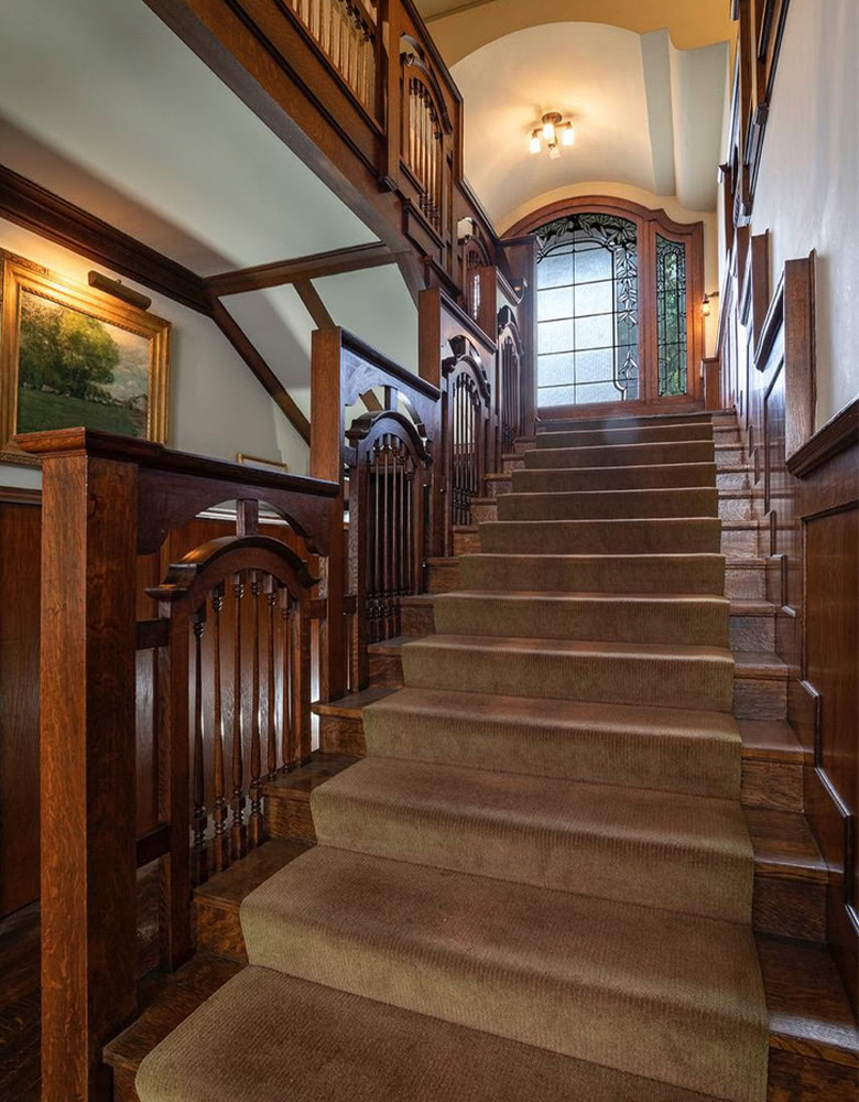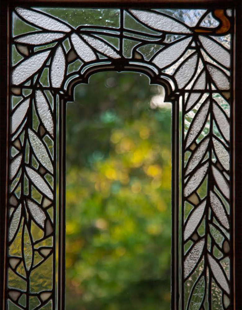 The fixation on detail is abundant in the Blinn House. Throughout both the interior and exterior, you see a callback to these beautiful wisteria vines that line the garden. From the repeating pattern of the wisteria vines in the art glass (in the windows lining the home, the ornate light fixtures, and the fireplace facade) to the broken arch motif (in the archways, furniture, windows, and the staircase banister), there is a special, intentional focus on harmony within the space.