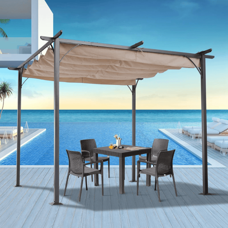Nothing says “home” quite like the glow of a fire. If you want that living room vibe outside, start by building a hearth to gather around. Of course, a full-size stone fireplace is the ultimate luxury. But thankfully, there are tons of portable, affordable fire pits on the market now too that offer the same warmth. From small tabletop fire pits to larger sleek iron options, each can complement a variety of design styles as well. Bonus: They’re the perfect centerpiece to an outdoor seating vignette.