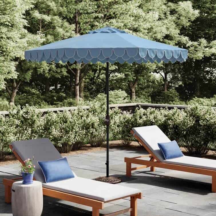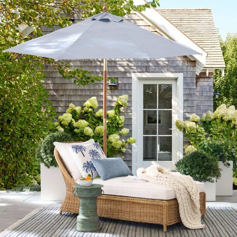 Adding a bit of strategic shade to your backyard isn’t just a practical way of getting some privacy and protecting yourself from the sun. Visually, it’s also a handy shortcut to carving a room-like zone out of open space. Let a large patio umbrella denote the dining area, while you use a pretty, patterned canopy to cover a casual seating area.
