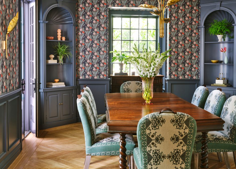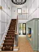 To give visitors a grand first impression, the couple turned the single-height entryway with a curved staircase into a double-height one with a traditional stair, featuring an iron handrail and Moroccan-style runner. They added custom millwork and a vintage chandelier to reflect the period in which the home was built.