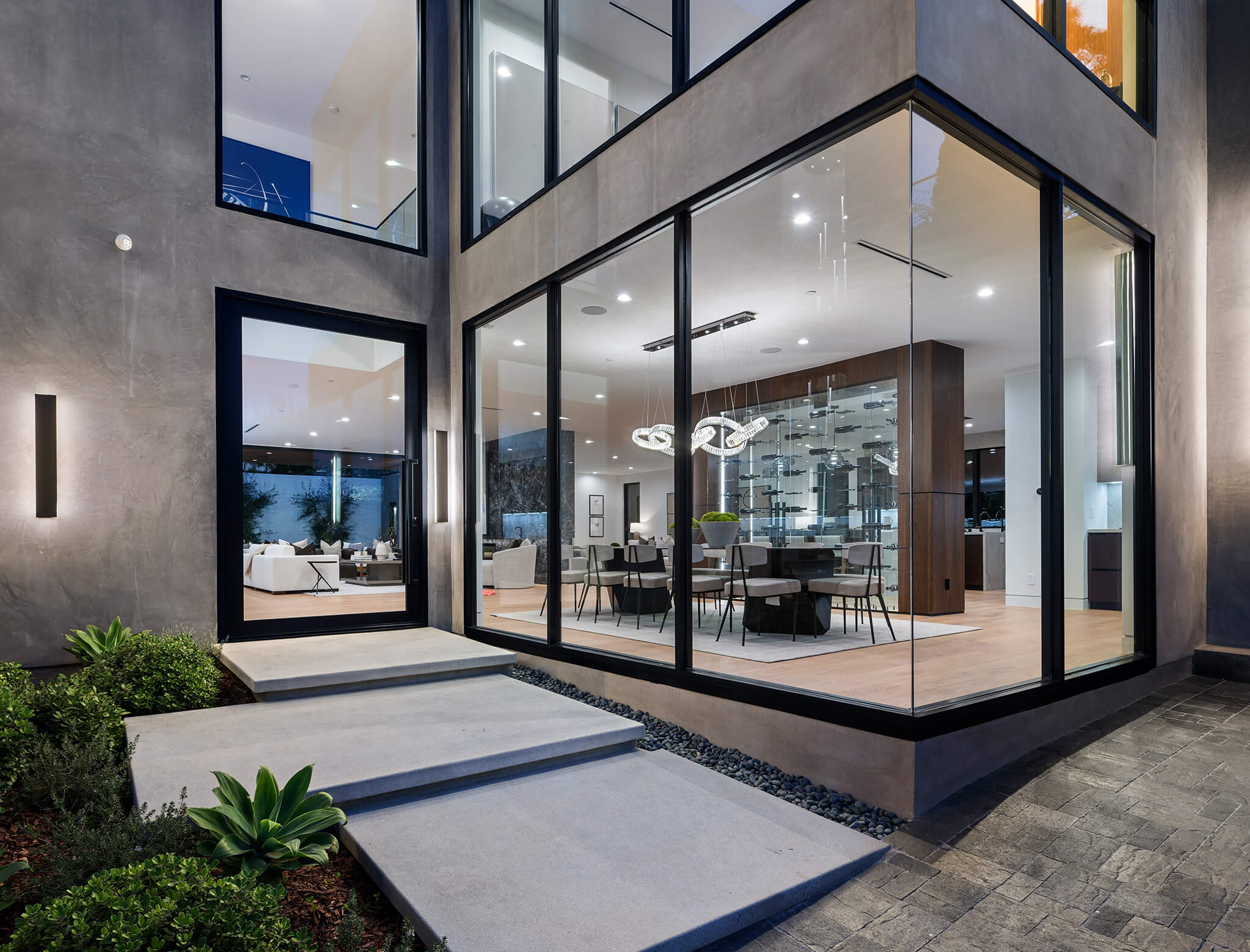 Corner windows will always make a big, bold style statement. We can’t stop staring! They look ultra chic and contemporary, especially against a concrete facade. The black trim here visually connects the window to the front door seamlessly. One thing we may recommend, though? Smart shades for privacy.
