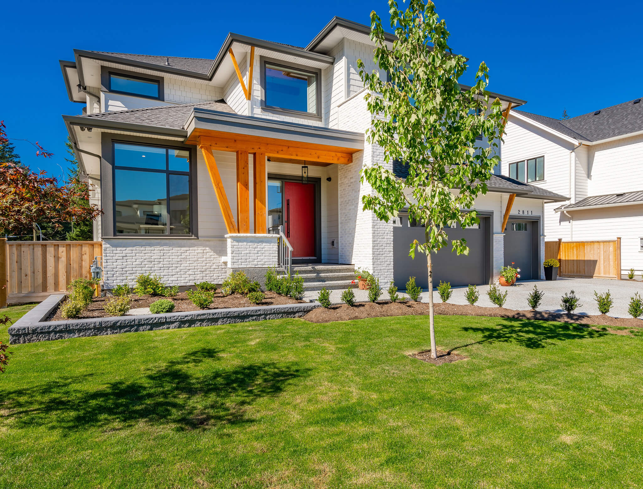 The combination of shape, color, and texture makes this home look modern and interesting. The wood, brick, and bright front door lend a playful energy that’s perfect for someone who’s looking for modern house exterior ideas that are far from cookie cutter.