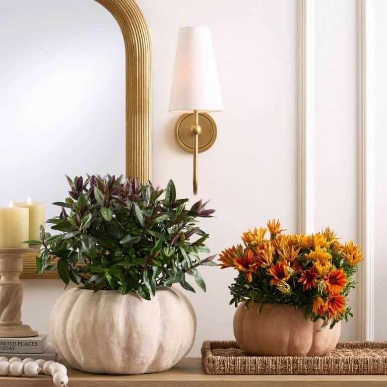 Pumpkins (of course!): Is there anything more festive and fun than artificial pumpkins in the fall? Place them in an oblong bowl as a centerpiece on the dining table, or display small groupings of them throughout the house. Purchase in a cozy fabric like velvet and they’ll be a complementary addition to any style space.