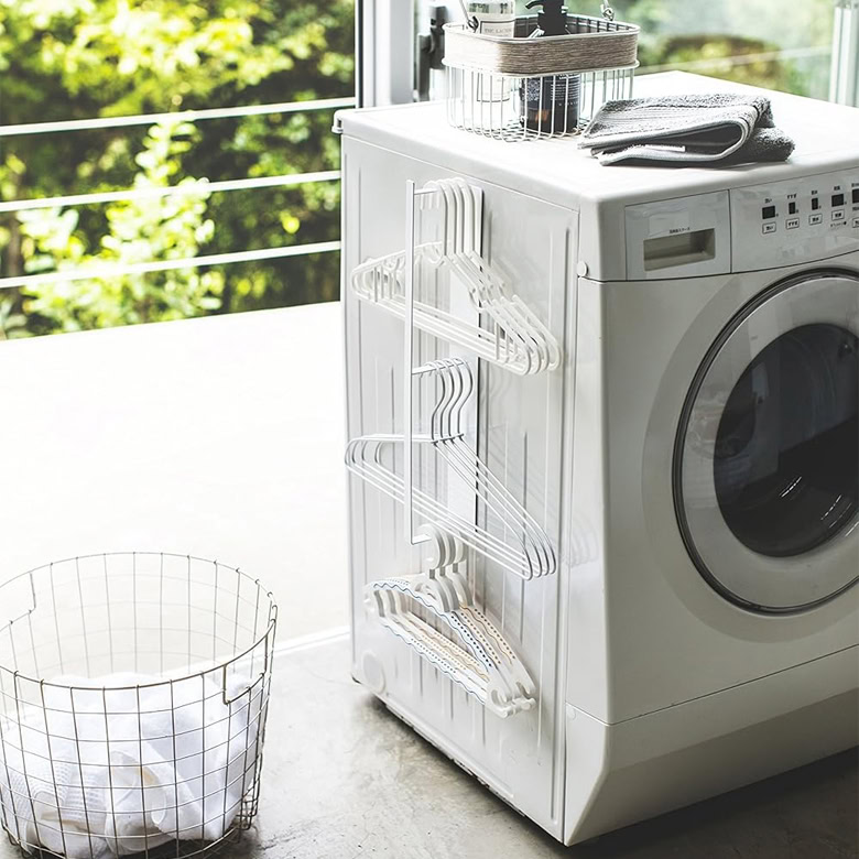 We all know how important it is to hang-dry some of our clothes. But all those extra hangers can take up space when you’re not using them. Make the process easier and keep the visual clutter to a minimum by storing your extra hangers on a hanger rack in your laundry room. You can mount this one on the wall, or use the magnetic grippers to stick it on the side of your dryer.