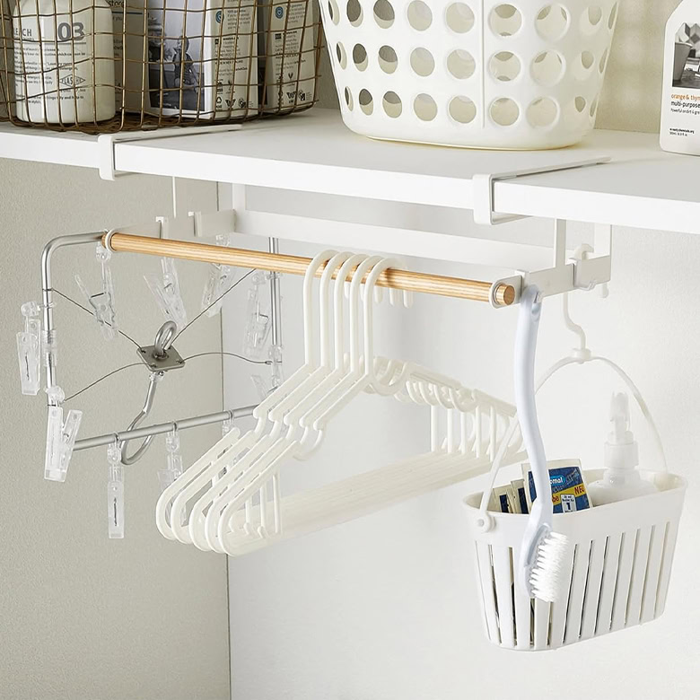 If your existing shelves are getting crowded, an under-shelf rack can create extra storage where there once was none. Whether you choose one with wire baskets, clothing rods, or hooks, it gives you a handy spot for extra laundry supplies. You can even add additional hanging baskets or hooks to the shelf to maximize this simple storage solution.