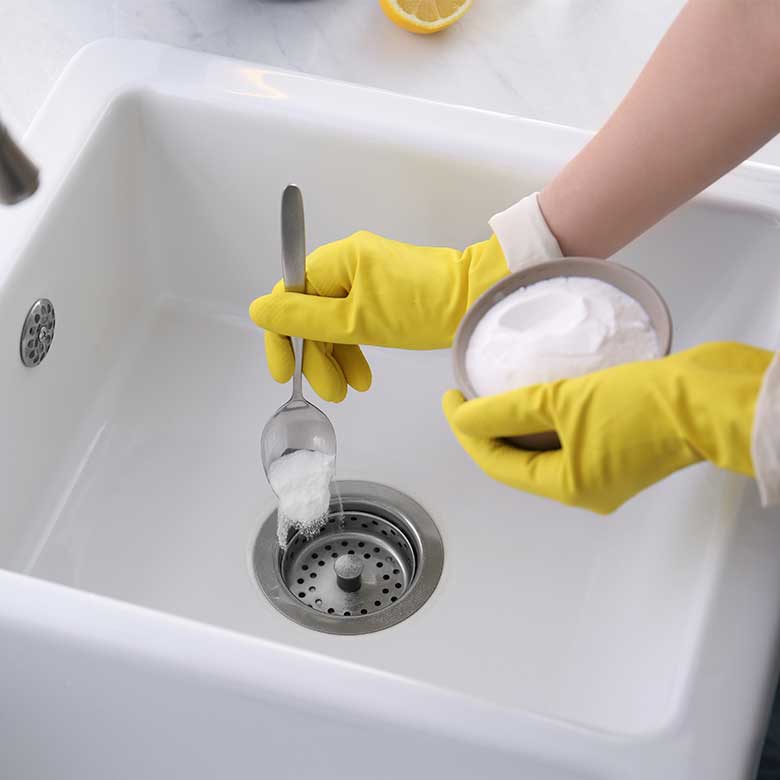 For a deep cleaning that will remove harder-to-get buildup, flush the disposal with the cure-all combination of baking soda and vinegar. First, drop a half-cup of baking soda into the disposal, then slowly add a cup of white vinegar. Let it sit for at least 10 minutes, then flip the switch to “on” and flush with hot water for 30-60 seconds.