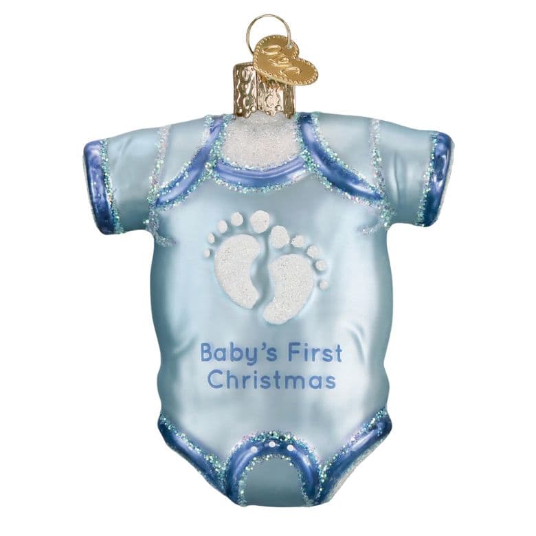 Crafted from fine blown glass and dusted with sparkling glitter, this Old World Christmas ornament looks just like a baby onesie, complete with adorable tiny footprints. Available in soft blue and pink, it’s a delightful addition to your tree—who could resist such cuteness?!