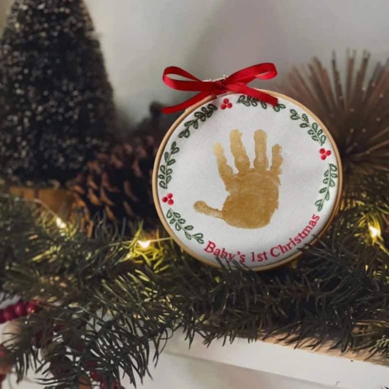 There’s a certain charm that comes with handmade Christmas decor, and this embroidery hoop ornament perfectly encapsulates that—even if you’re not the crafting type. On it, two evergreen sprigs call attention to your little one’s name, which is hand-stitched into the center with vibrant Christmas red thread.