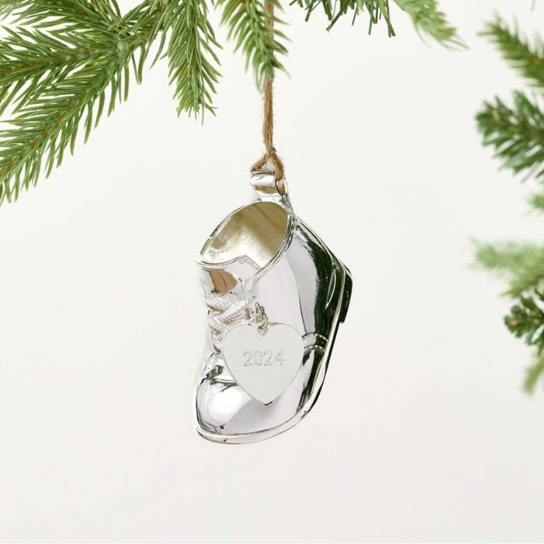 Made of zinc alloy with a silver-plated finish, this classic baby boot ornament looks perfect tucked into a timeless red and green Christmas tree. While it’s not personalized with your baby’s name, it does feature a dangling heart charm with the year of their birth on it. It’s a subtle and sweet nod to the most transformative 365 days of your life.