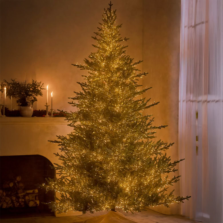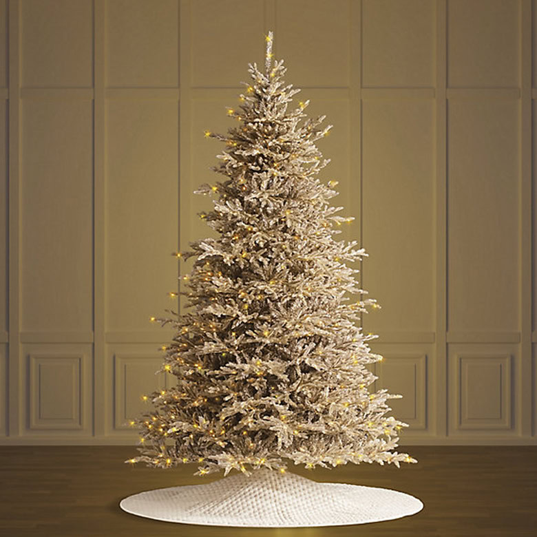 Pre-lit (and stay-lit) bulbs ensure your tree will always be glowing, even if one dies or goes missing. This artificial Christmas tree brings all the holiday magic without any of the hassle. Frosted branches look just like the real thing, mimicking a freshly-flocked Aspen fir. It measures 7 feet 6 inches high, and 5 feet wide.