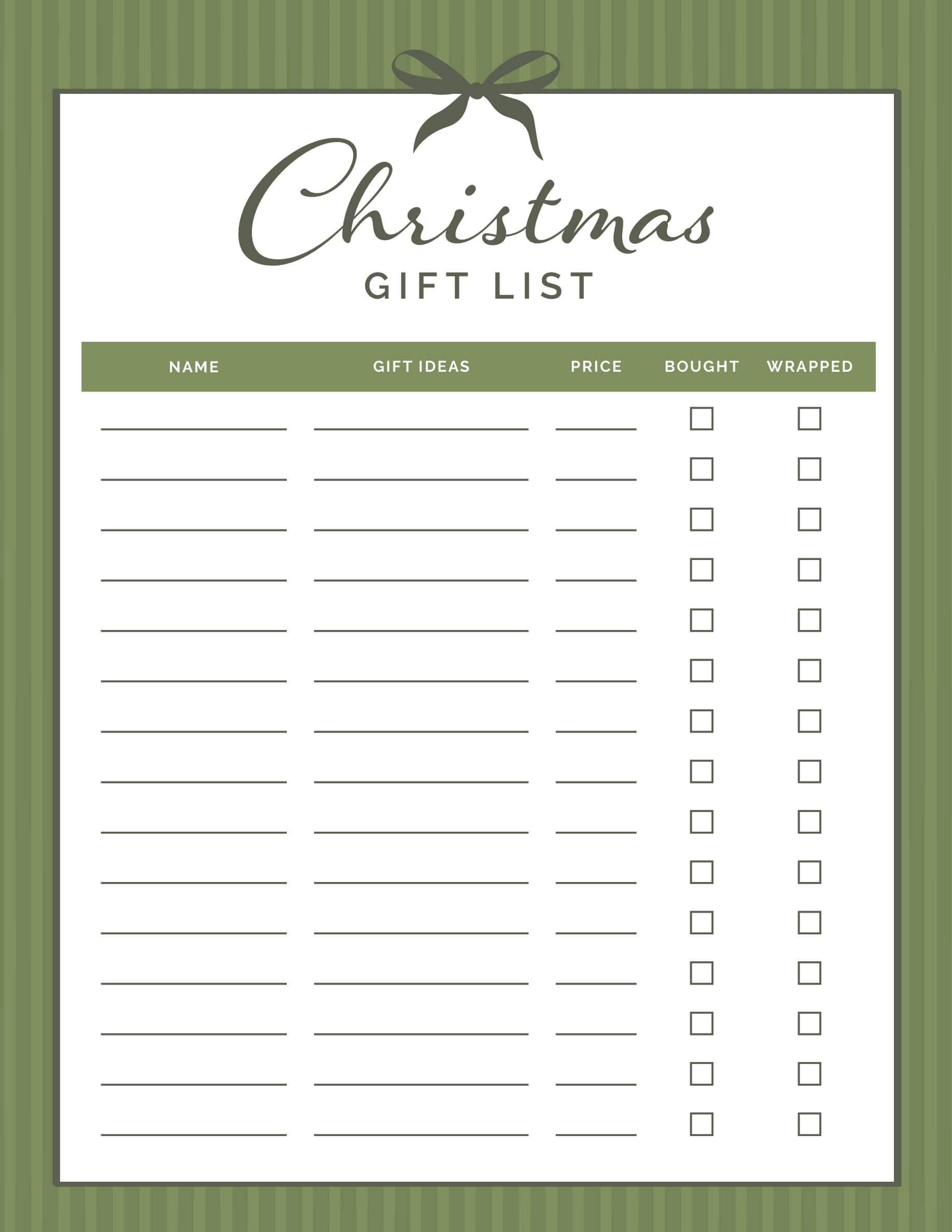 Keep track of your giftees and gifts with this organized Christmas gift list. Here, you can write down their name, gift ideas, prices, and keep track of whether it was bought and/or wrapped yet.