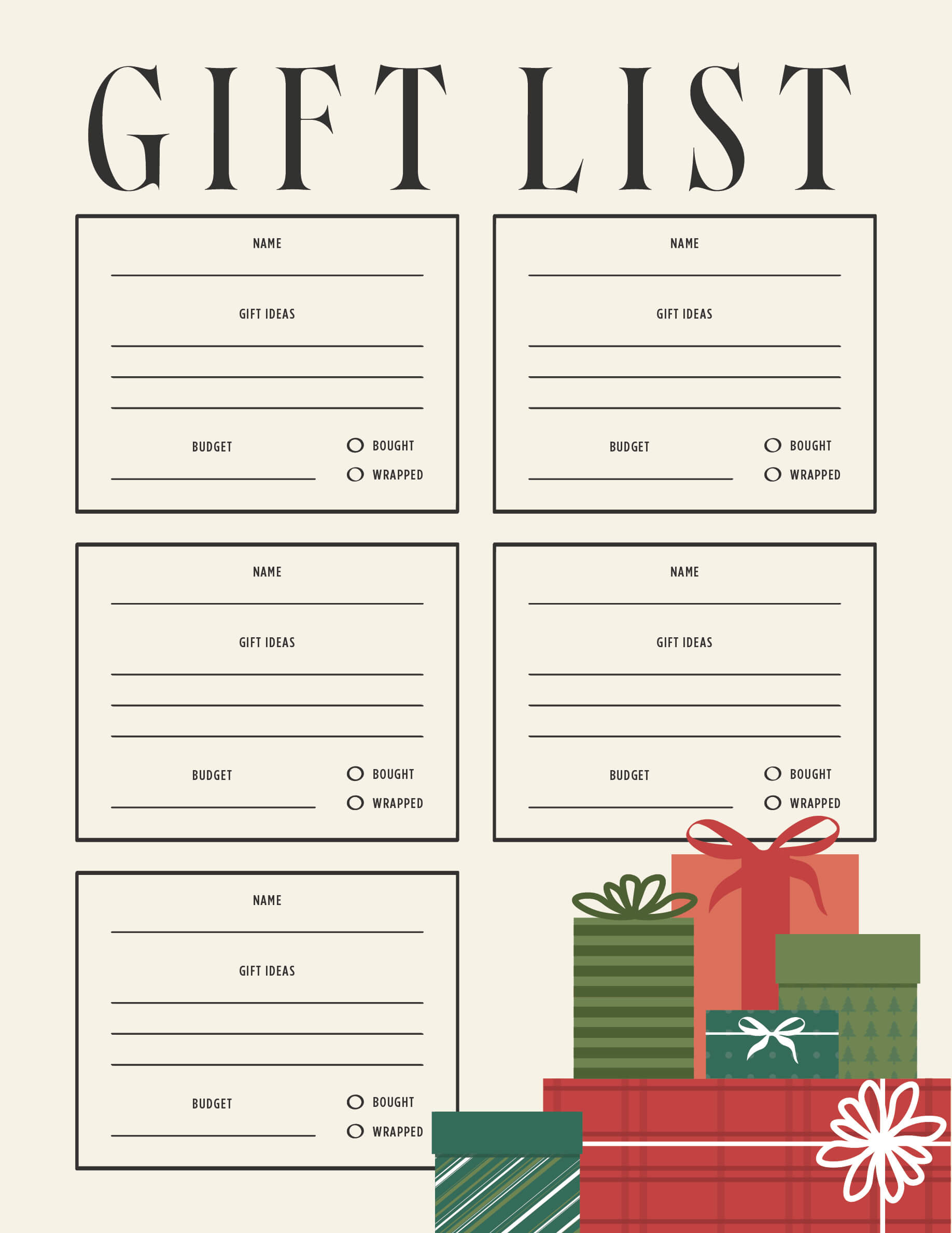 If you prefer to keep your gift tracking list arranged by giftee, then this one could be your perfect fit! A chic bundle of presents in the corner adds the finishing touch to the minimalist design.