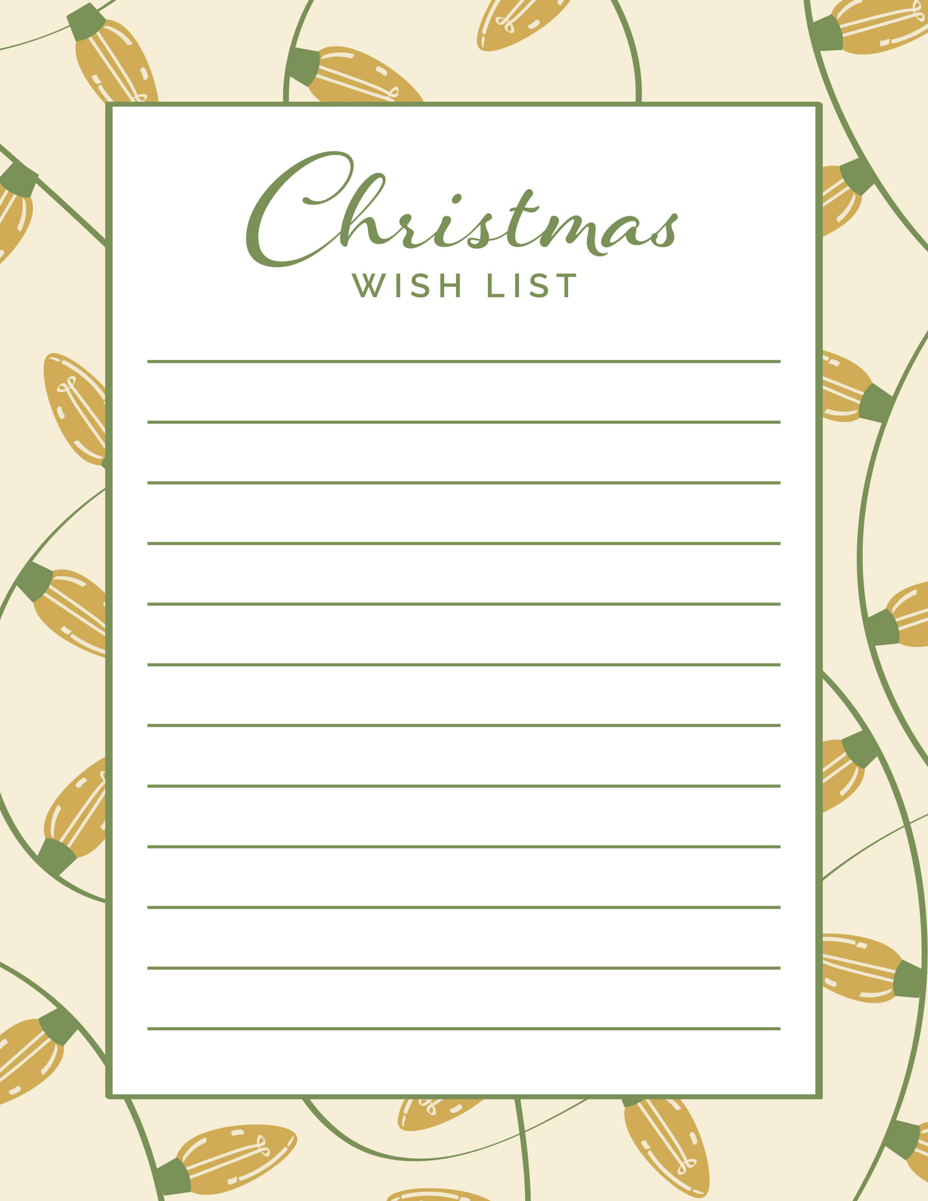 Whimsical Christmas lights line the border of this simple Christmas wish list. They can write out a note to Santa, make a list of all their most-wanted toys, or even just use the page as a place for holiday doodles.