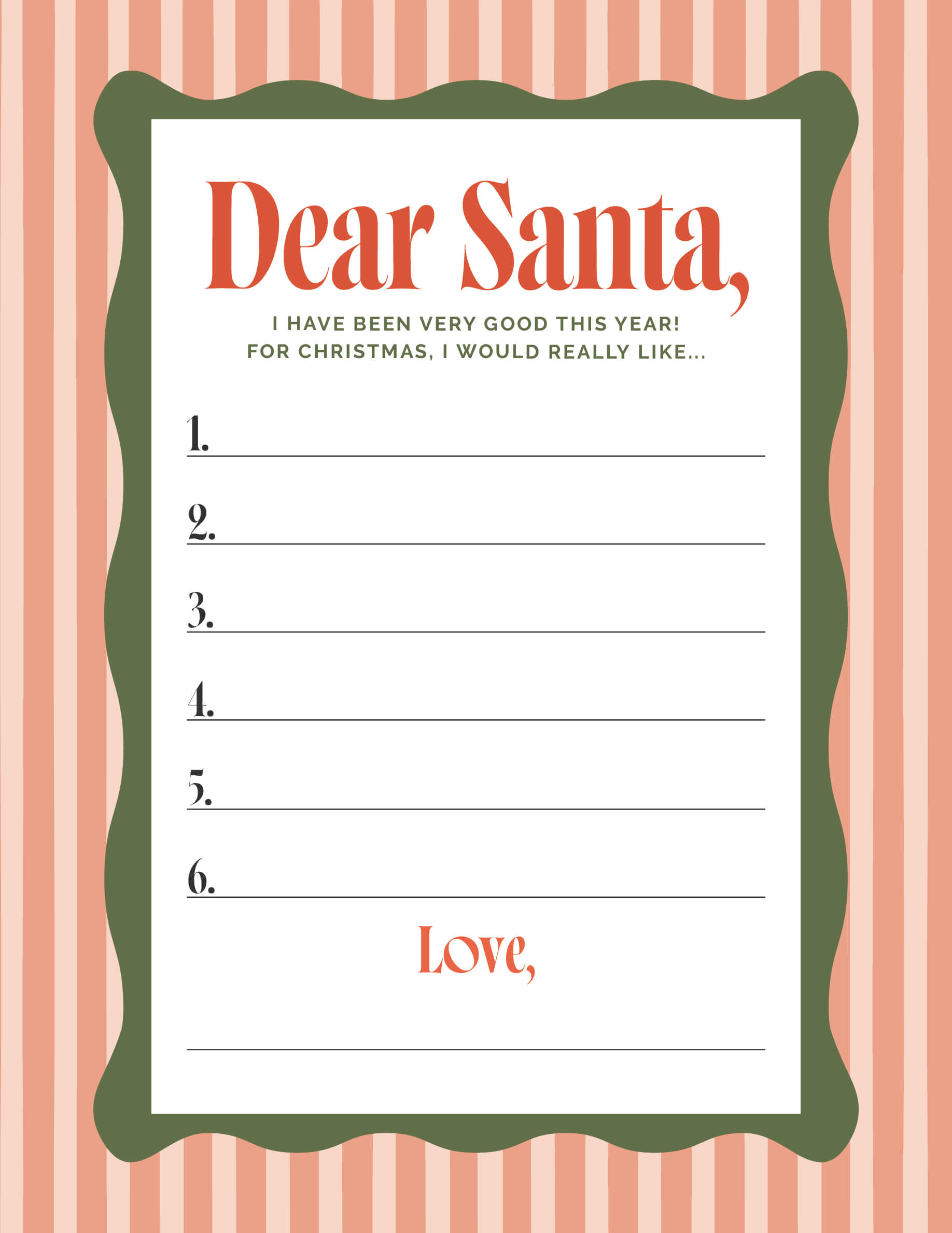 Whimsical holiday stripes make for a modern look in this Santa Claus wish list template! With room for just six wish list items, they’ll be thoughtfully limited to think of their most hoped-for presents.