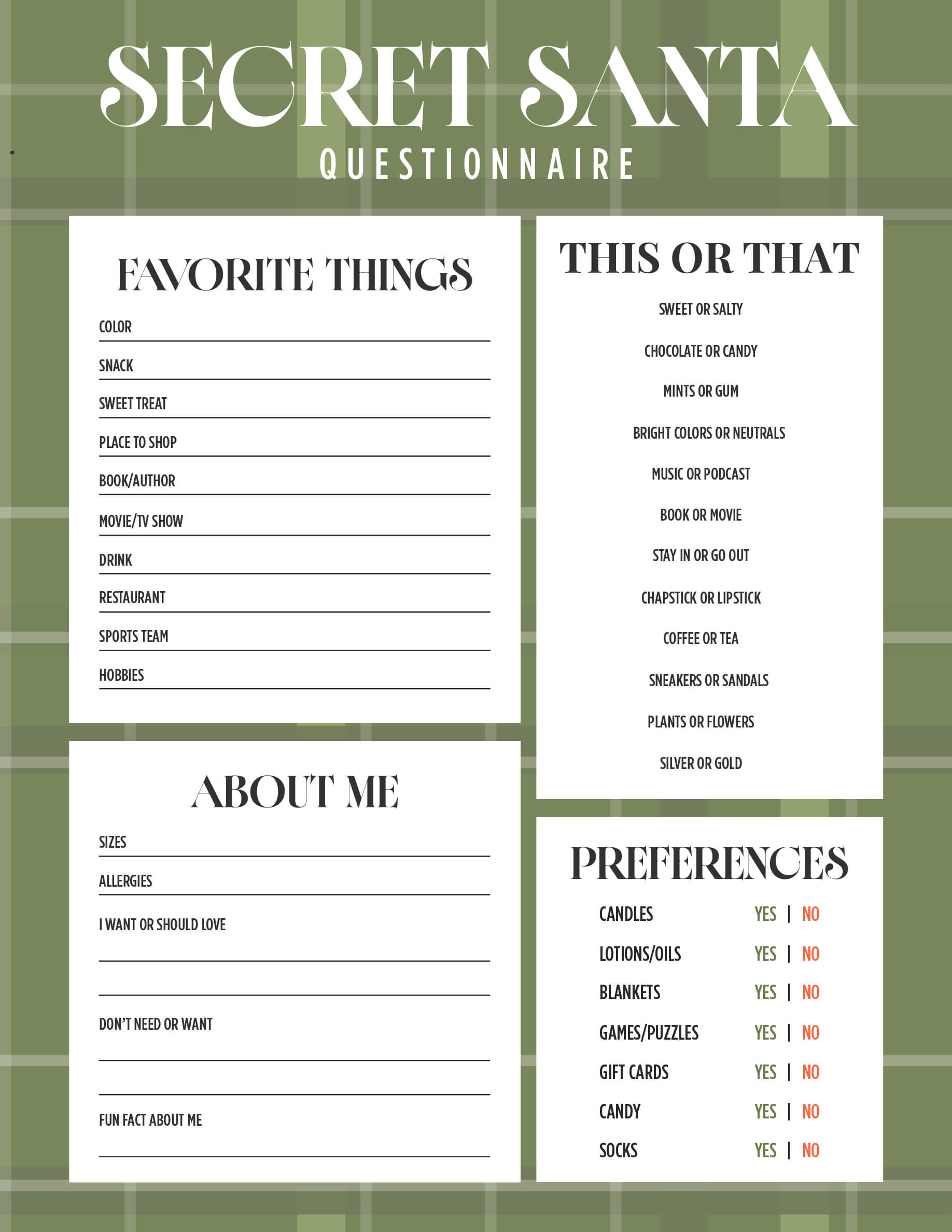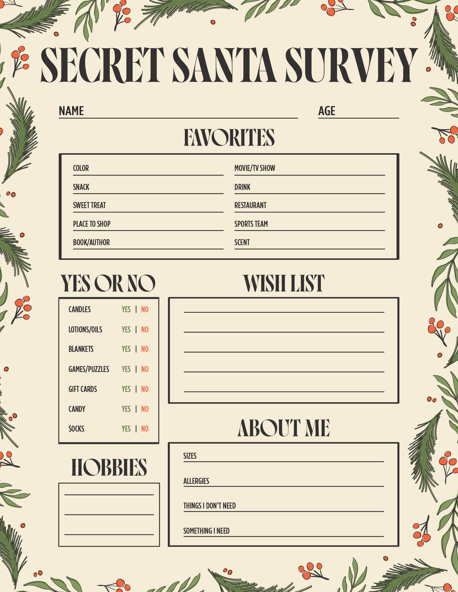 This Secret Santa survey touches on helpful pieces of info for each player, too—like their favorite colors, scents, and shops, as well as a special spot to detail hobbies and wish list items. With this, your Christmas game will go off without a hitch!
