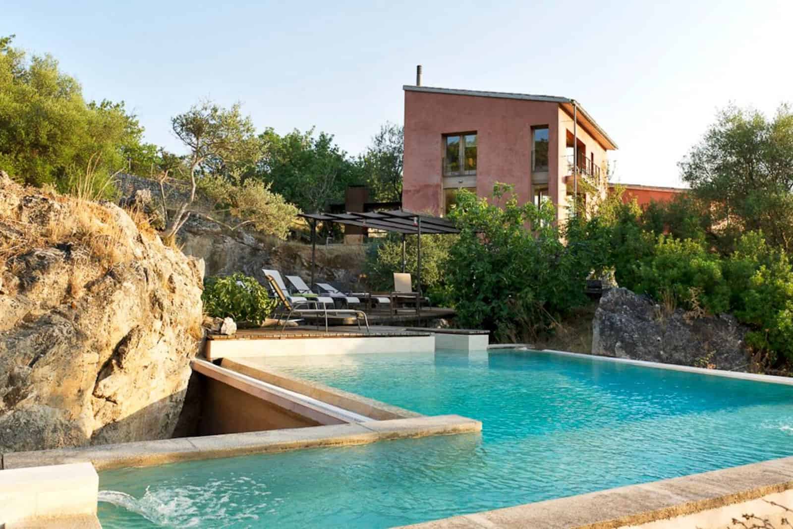 This beautiful mountainside home sits in the heart of Mallorca in the UNESCO natural reserve of Sierra de Tramuntana. The house is terraced with an artist studio, equipped with a gorgeous pool, and framed by breathtaking views of the forest and mountains.