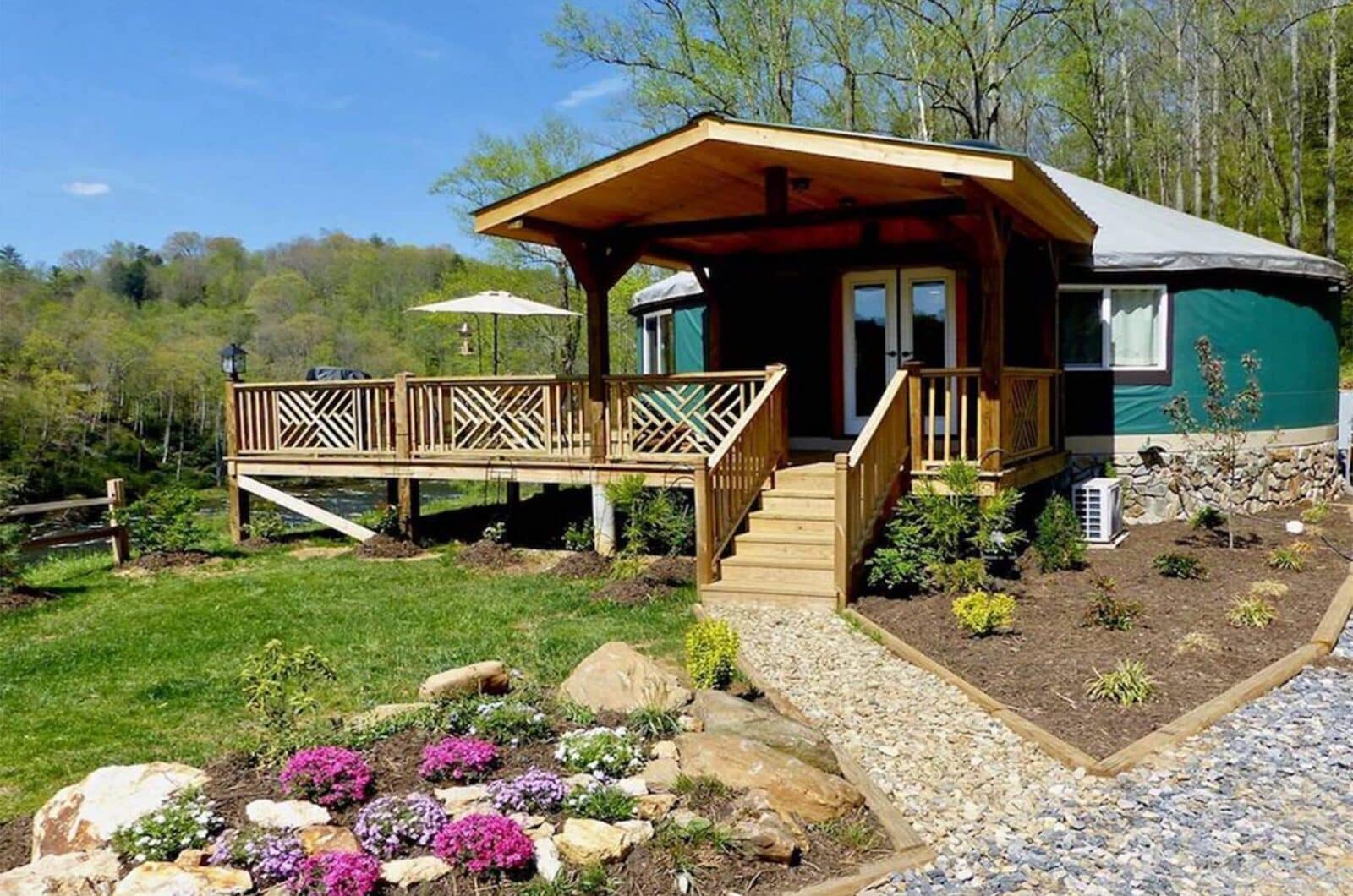 A circular dwelling meant to evoke a sense of zen, this yurt in Clyde, North Carolina, has all the luxuries of a modern home with the benefits of a camping adventure. The porch is the perfect place to sit, relax, and listen to the babbling of the river.