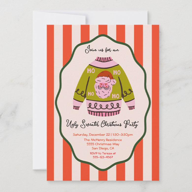For an ugly Christmas sweater party, these invitations sure are fabulous! Illustrated sweater motifs on the front of your invites are a sweet nod to the theme, and receiving a paper invite in the mail adds that extra thoughtful touch. It serves as its own decoration on your guests’ refrigerators, too.