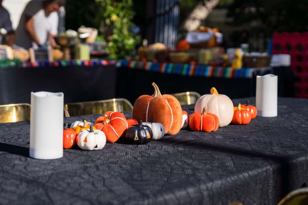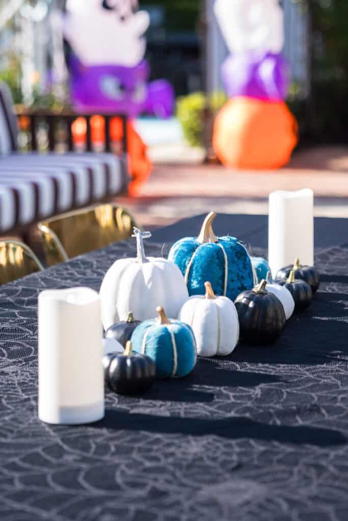 For the table centerpieces, he grouped colorful pumpkins and flameless candles for a stunning (and kid-safe!) scene. Bonus: If you try this look at home, these pieces are versatile enough to work for Thanksgiving, too. Nothing better than double-duty decor!