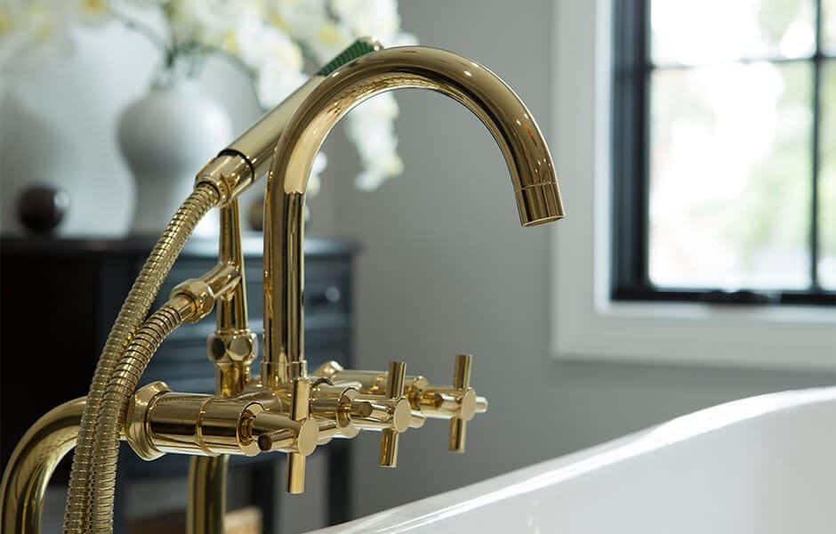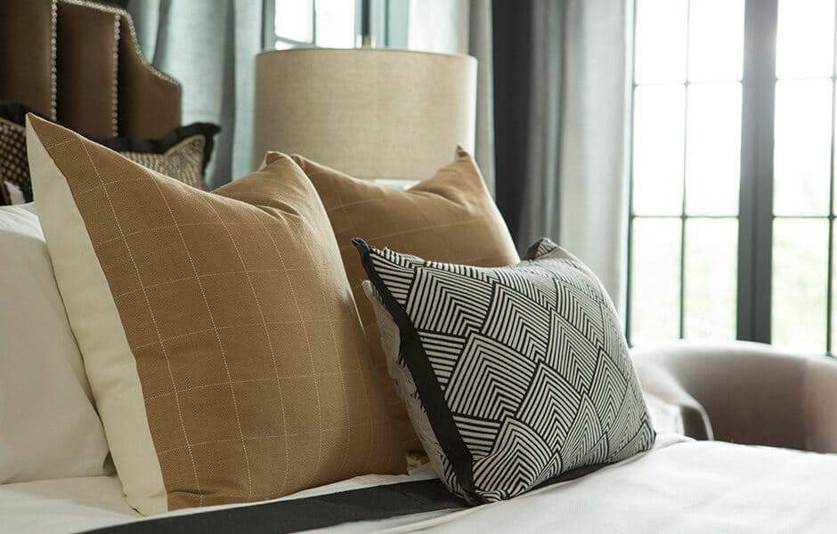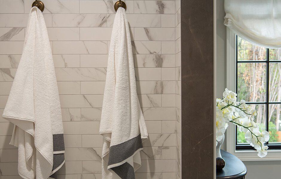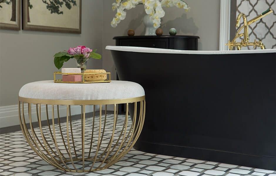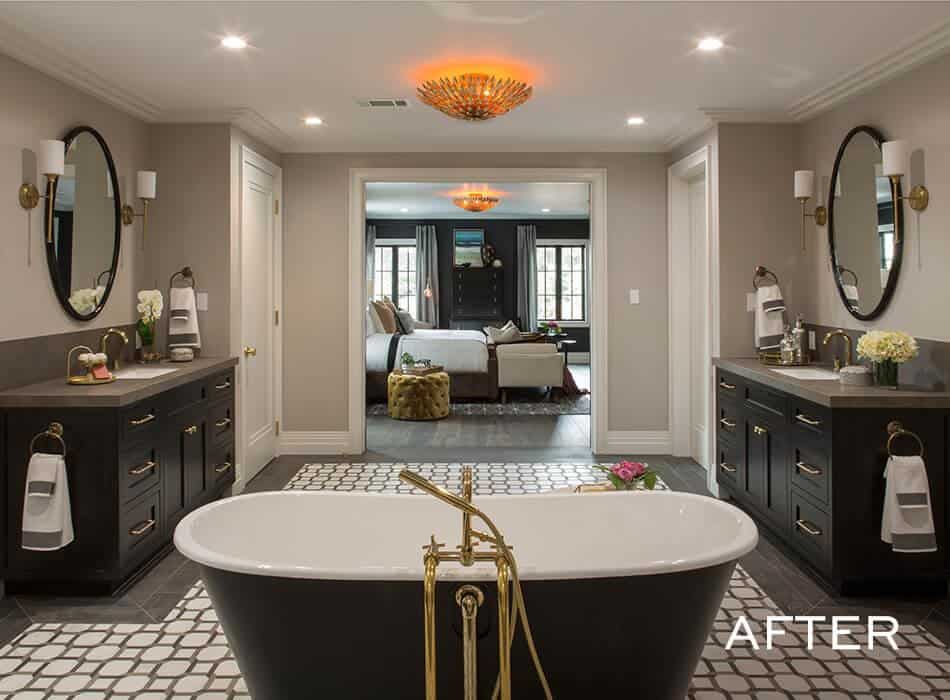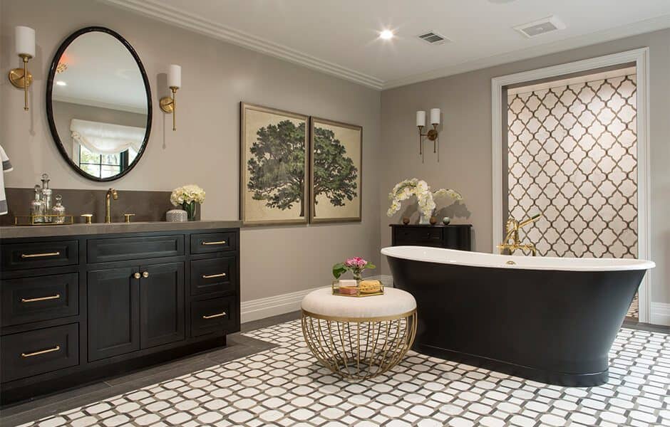 Speaking of tile, we framed the centerpiece—the beautiful soaking tub—with black-and-white tile, both on the floor and in the shower, that shimmered in the sunlight. This bathroom has a feature at every turn, and the tile backdrop highlights them all.