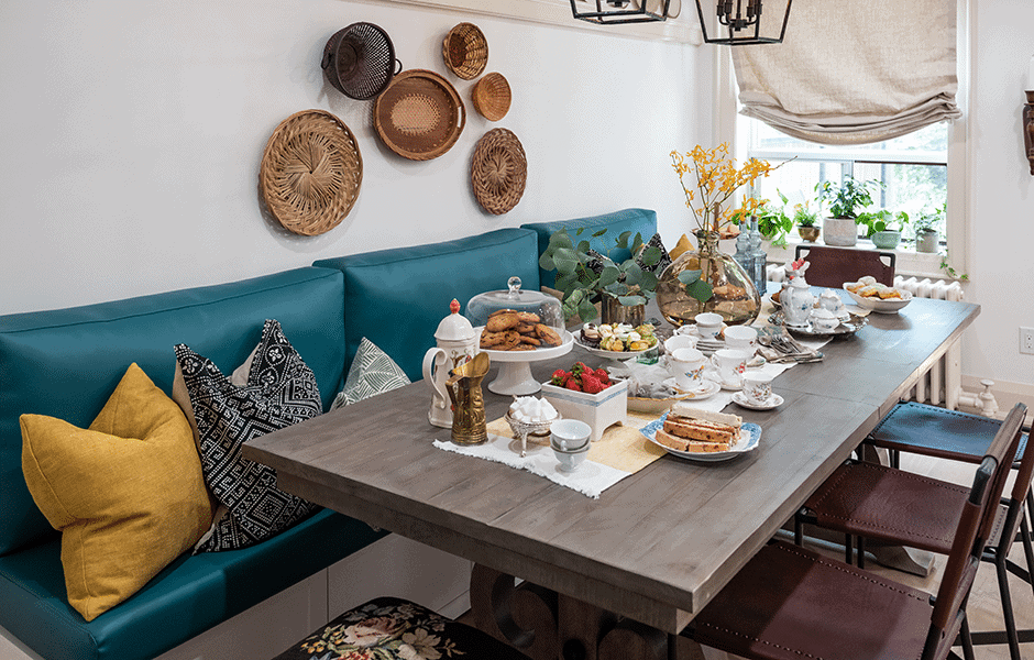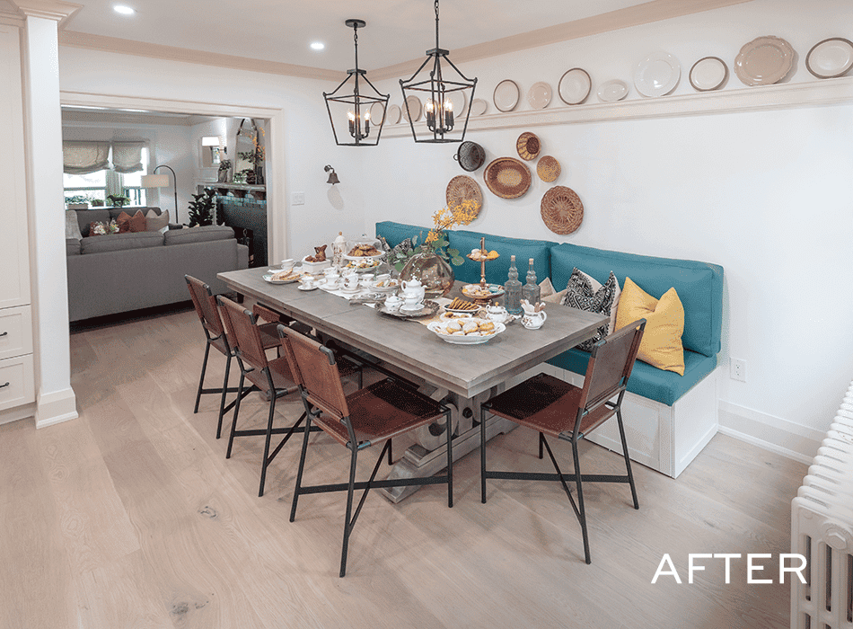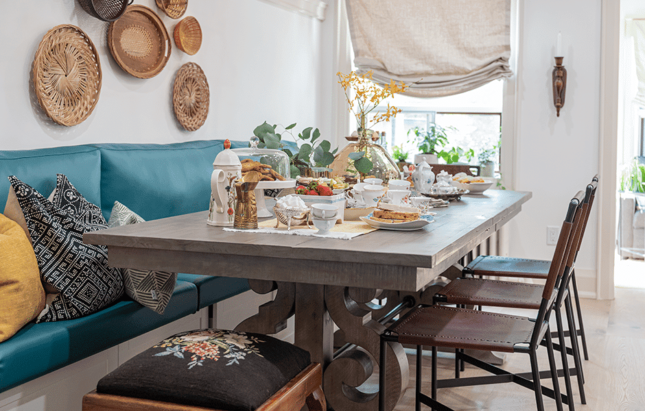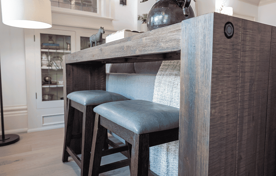 To accommodate for their love of hosting, we created an amazing, open entertaining space with a large dining table and expandable leaves to make room for everyone. The cozy dining banquette not only provides plenty of seating, but also provides tons of extra storage space underneath.