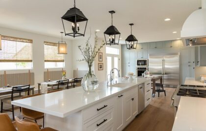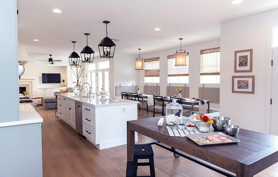 Of all the rooms in the house, Cody and Austin were most particular about the kitchen—and with good reason! The whole family likes to help cook, and the oldest kids are frequent bakers (they recently sold more than 40 dozen cookies to raise money for a vacation!). There also had to be enough room for the whole crew to comfortably sit down to a meal. An oversized island, dedicated baking station, and 22′ built-in banquette with dual tables ensure there’s a place for everyone in the family’s new kitchen.