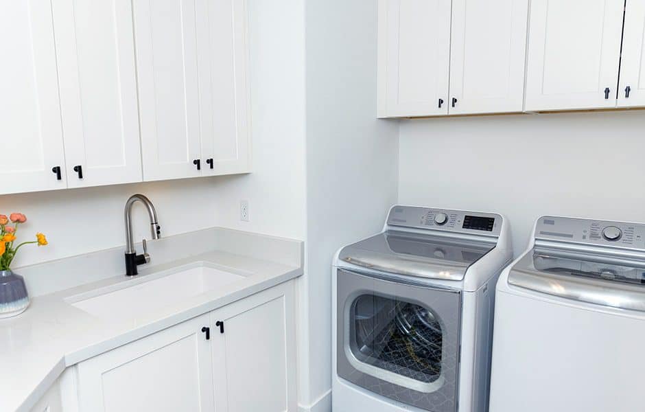 Doing laundry for 10 is a big job, and the home’s original laundry room was definitely not up to the task. We took out a closet to enlarge the room’s useable space, and also added more cabinets and counter space to make room for laundry baskets. We could have stacked the washer and dryer to even further maximize space, but side-by-side units are easier for the kids to operate, which was among the most important consideration for this room!