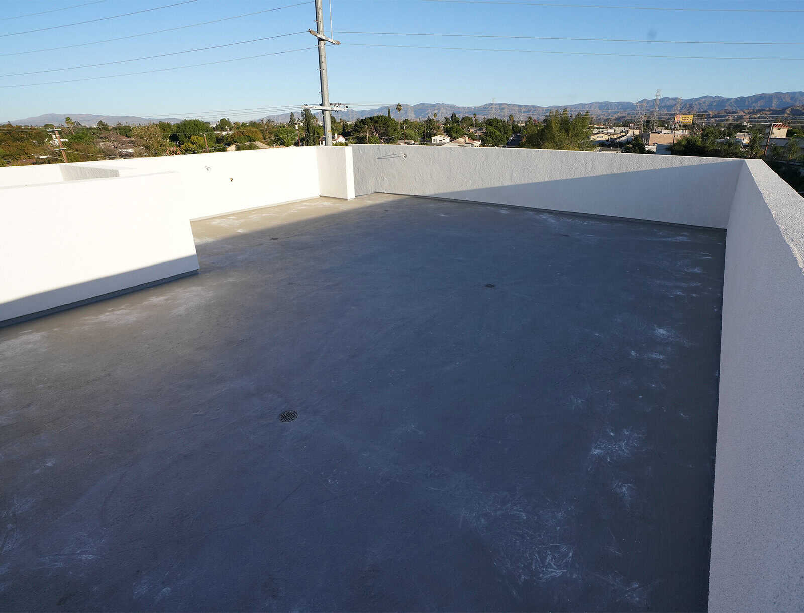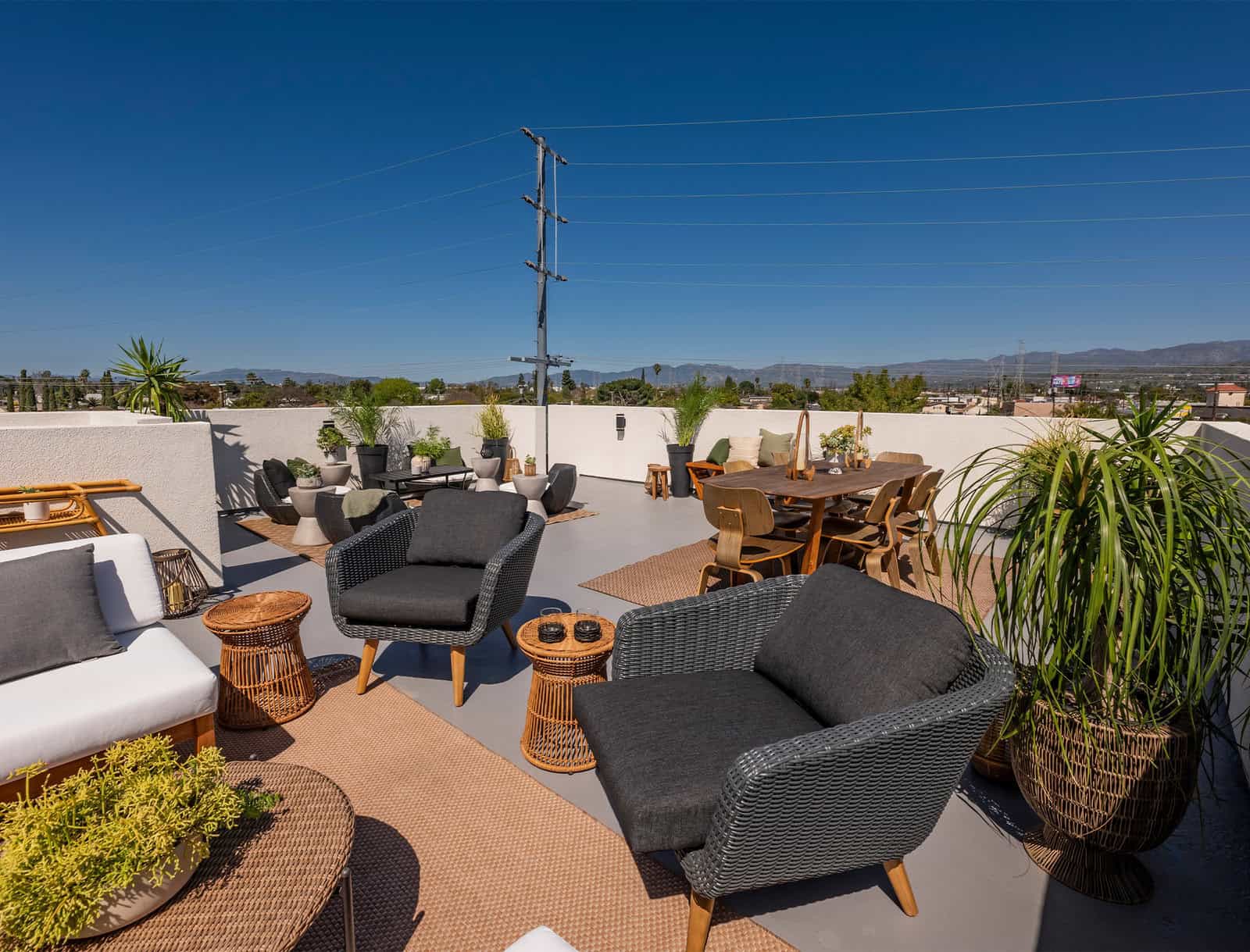 A bland and barren rooftop patio turned into a sleek and sophisticated hangout zone with simple additions like comfortable patio seating, plants, and area rugs to keep the space feeling cozy. But absolutely nothing beats that view!