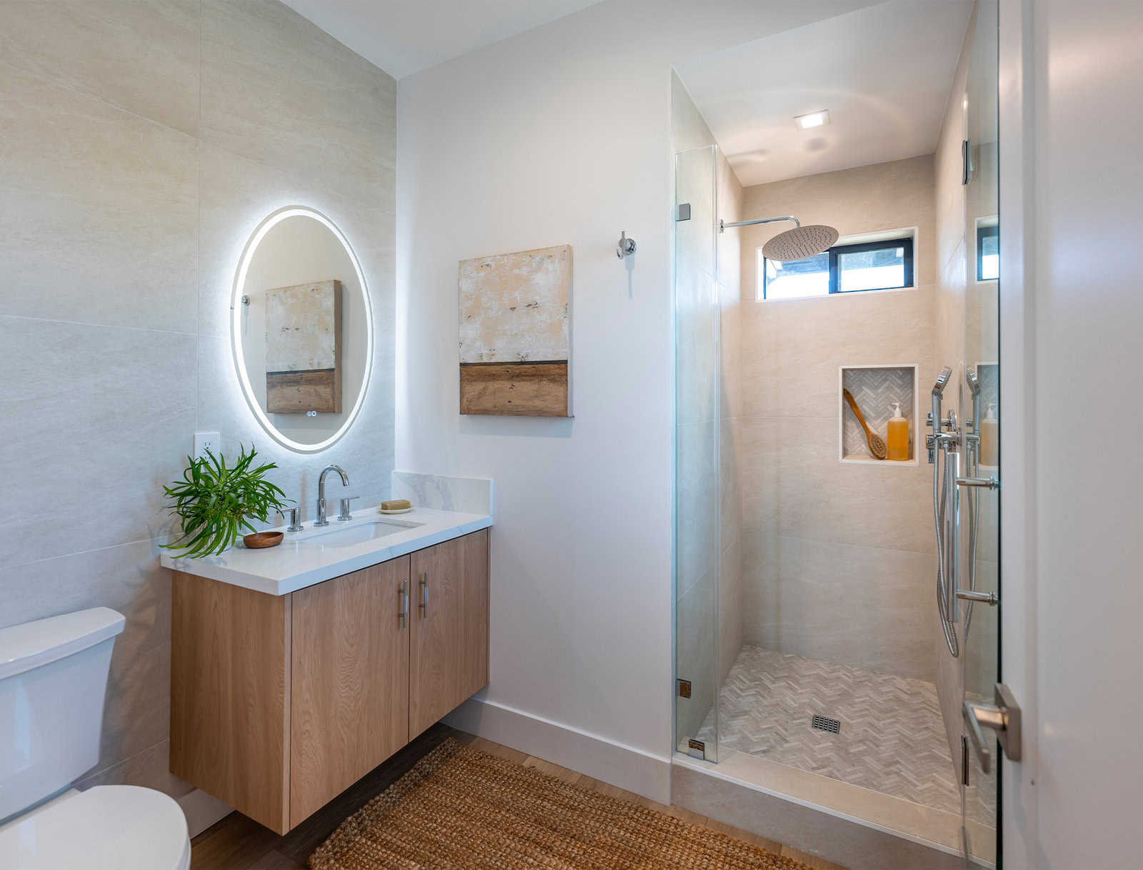 Sheryl loves using custom tile to adorn the bathroom, but in this triplex, it would have totally blown their budget. Instead, she got savvy with her methods and used big box tile and vanities to save on money, and utilized creative ways of installing them in order to create a statement.