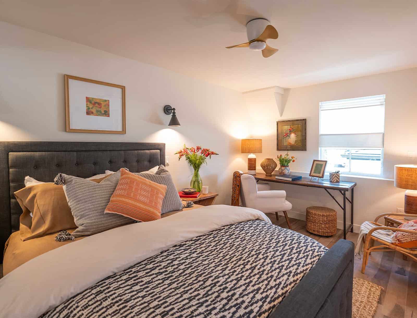This ADU bedroom feels anything but small. It comes complete with a desk nestled into the window nook, a lounge chair, and a closet with plenty of storage.