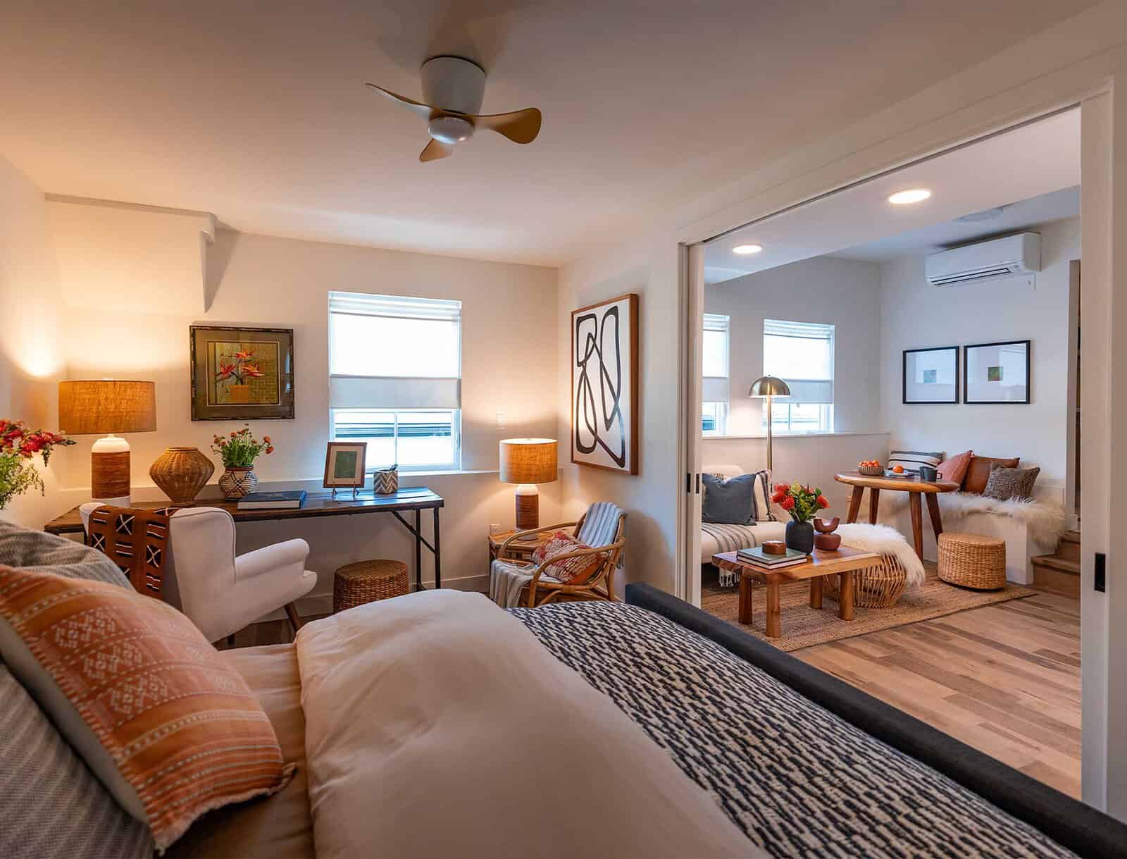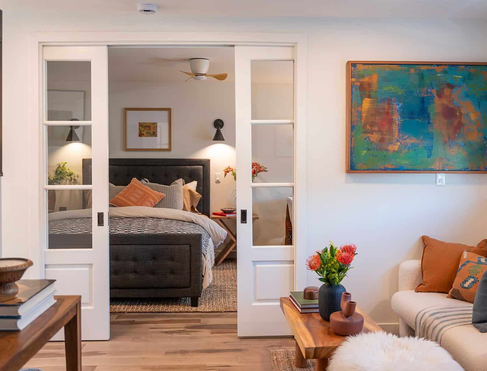 This double-door entry into the bedroom area isn’t just beautiful, but it’s also incredibly useful. It separates the living and sleeping areas seamlessly. Added artwork and warm-toned flooring create a cozy living area.