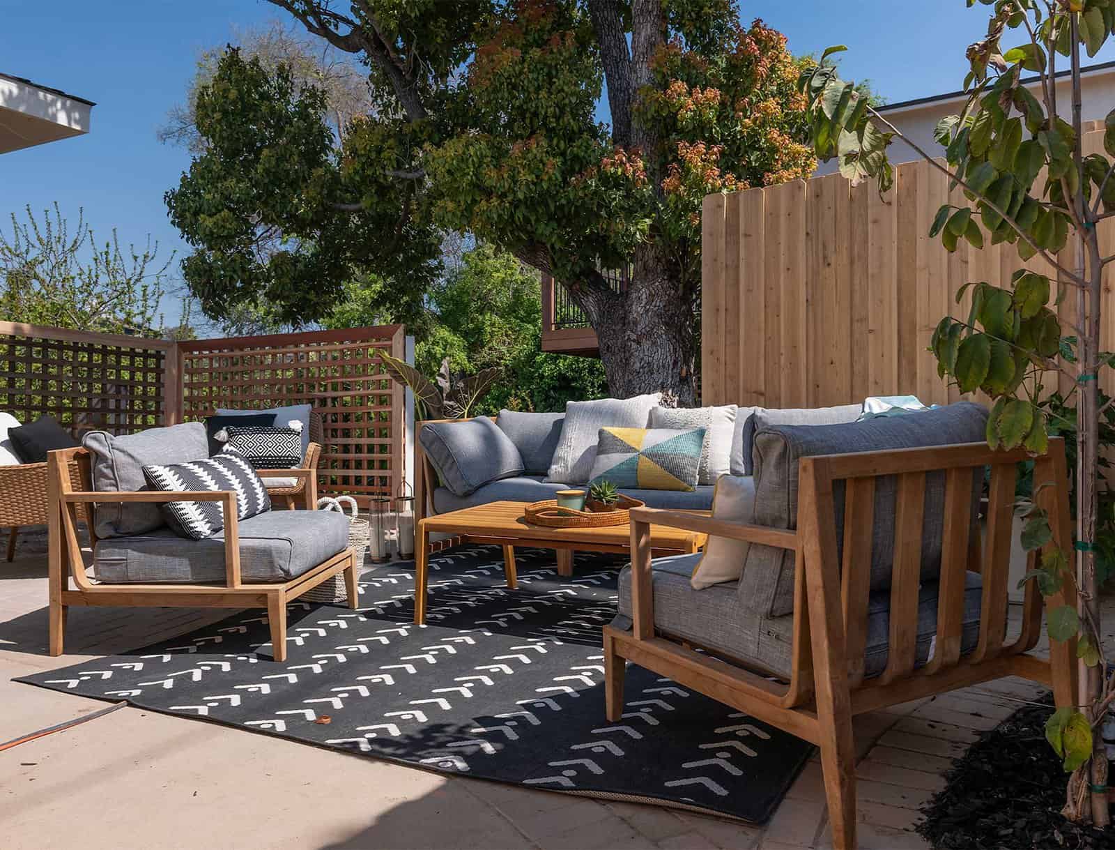 What was once an empty yard is now a fabulous backyard chill zone for friends and family to gather. Chairs and outdoor furniture make for plenty of seating while an outdoor area rug adds that much-needed warmth.