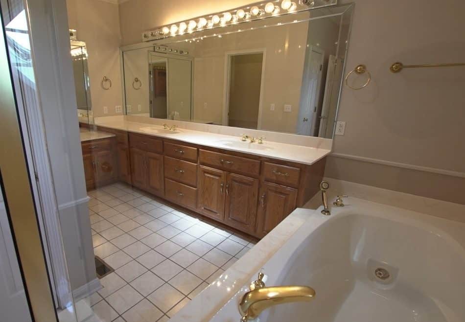 In the completely upgraded master bathroom, we clad part of the walls in a glossy subway tile, with dark grout for maximum contrast. It looked so amazing that we clad the walk-in shower in the same subway tile and grout, then added a niche with hex mosaic detail in white marble (which matches the shower floor) for a final flourish. So fresh and so clean!
