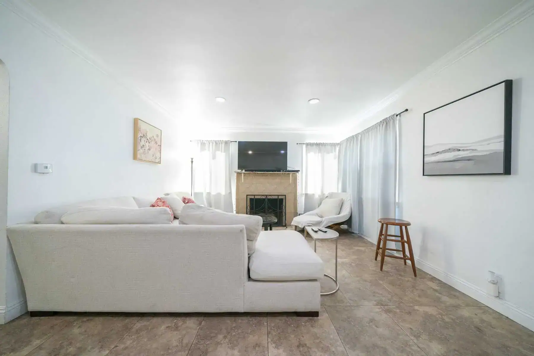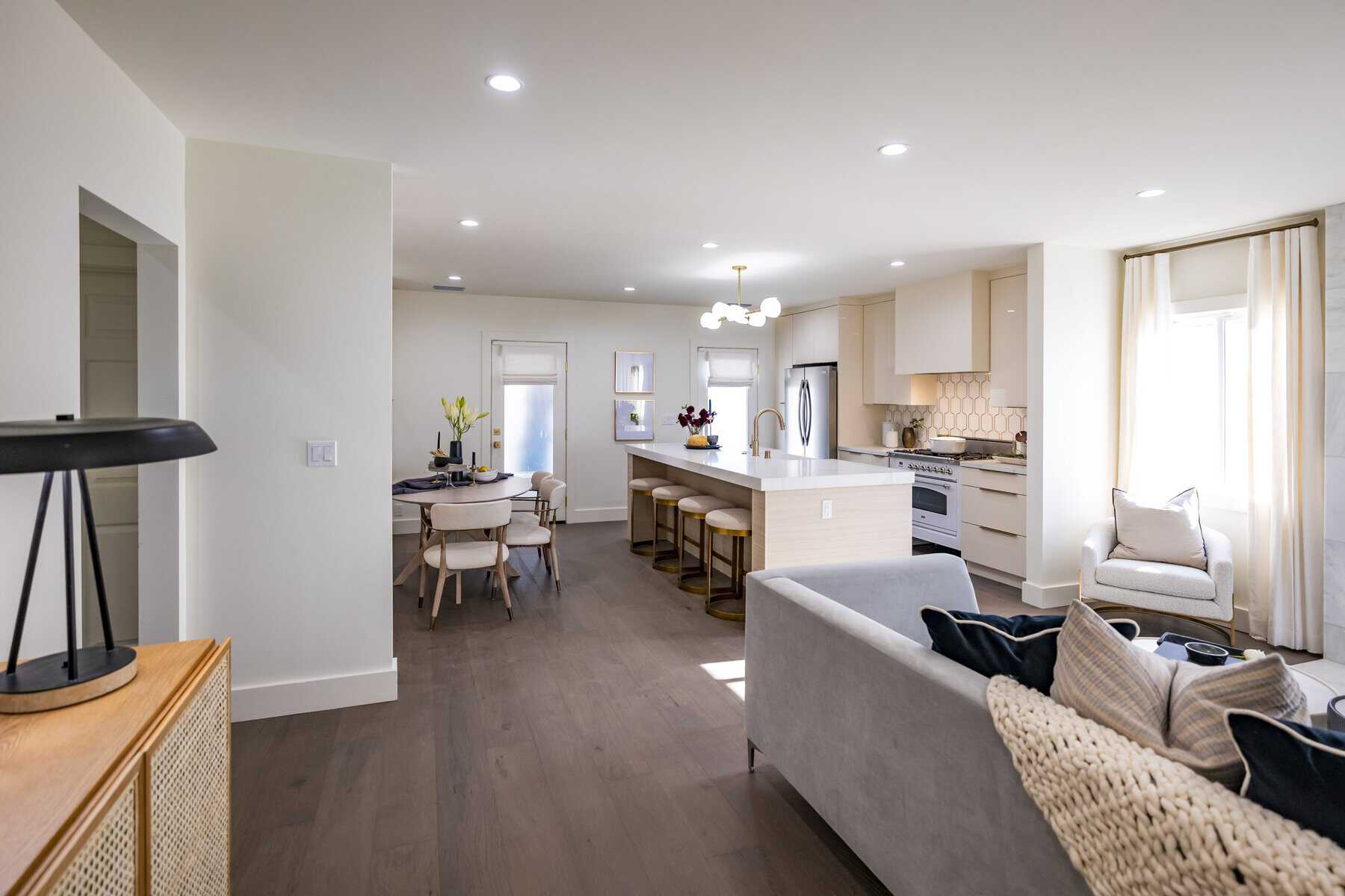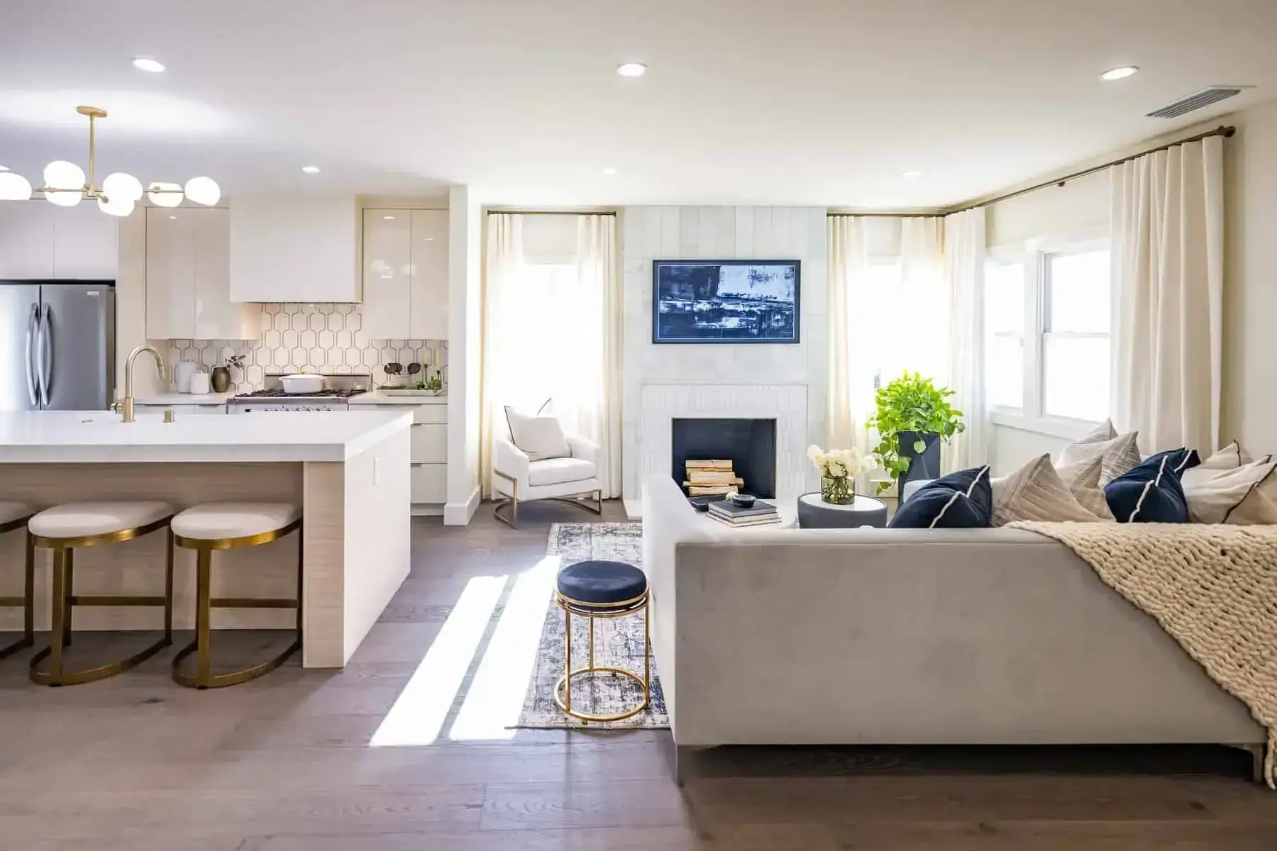 Kristin described Tiffany’s style as “glamor modern,” so when decorating the living room, we wanted to make sure the furniture was as stylish as it was comfortable. The new European oak flooring is also much more elegant than the dated tile she used to have.