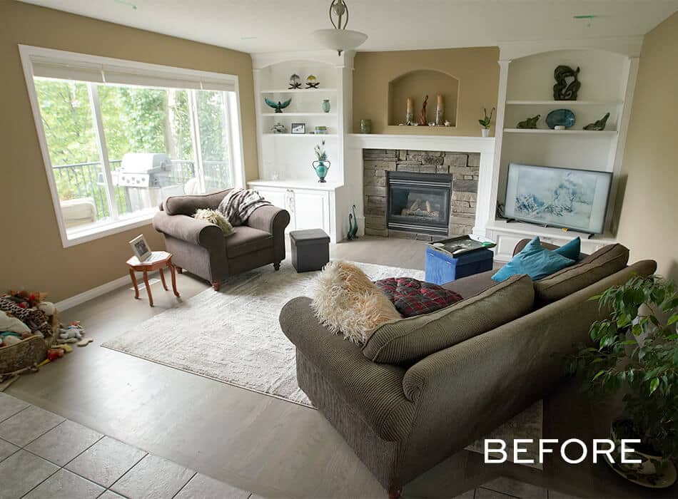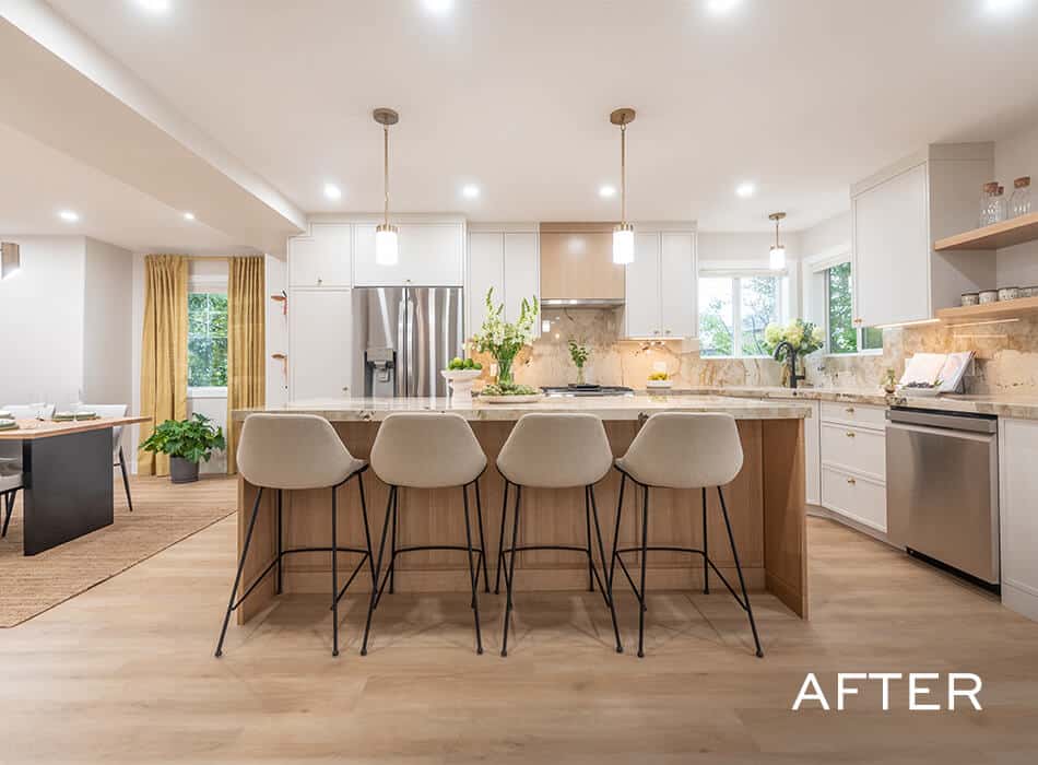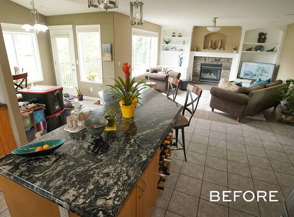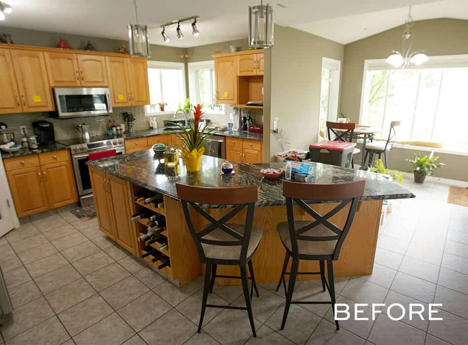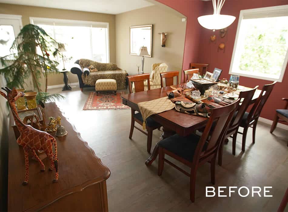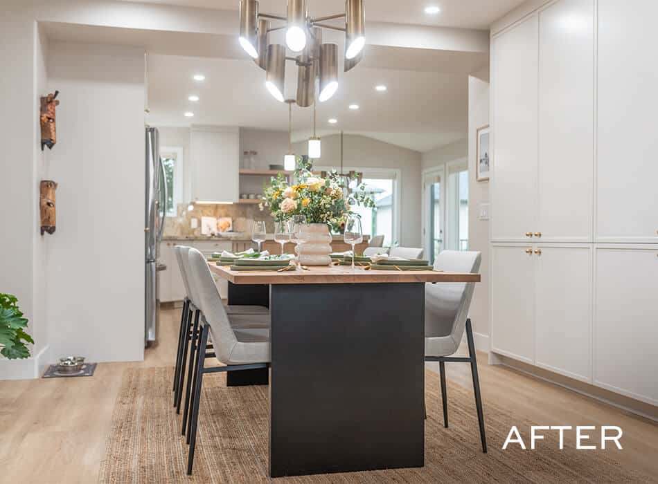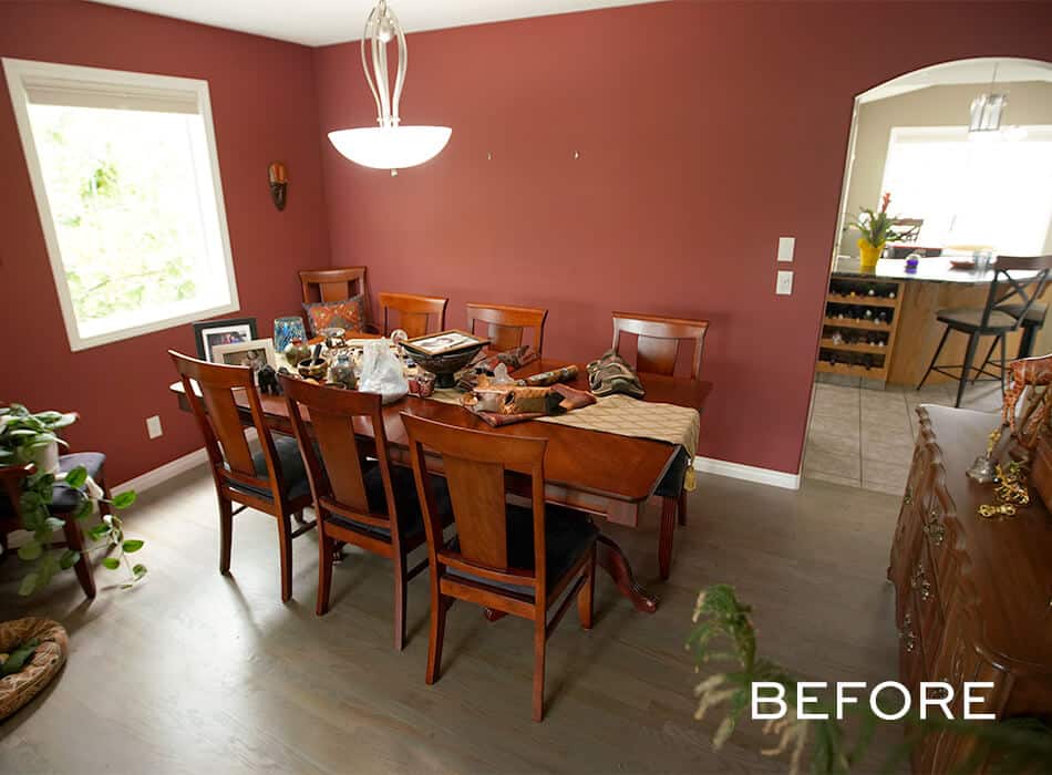 Bob and Reiki-master Denise had made many happy memories in their suburban home, and they had no intention of ever leaving. The home had a great layout, a large yard with a beautiful garden, and a cherry tree. But the house’s dated oak finishes, cluttered areas, and choppy layout were weighing on the couple. They needed help revamping their home to make it a space with positive energy and flow. We redesigned the front entry, living room, dining room, and kitchen to create a balanced, calming environment in which Bob and Denise can continue to make happy memories.