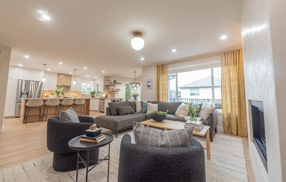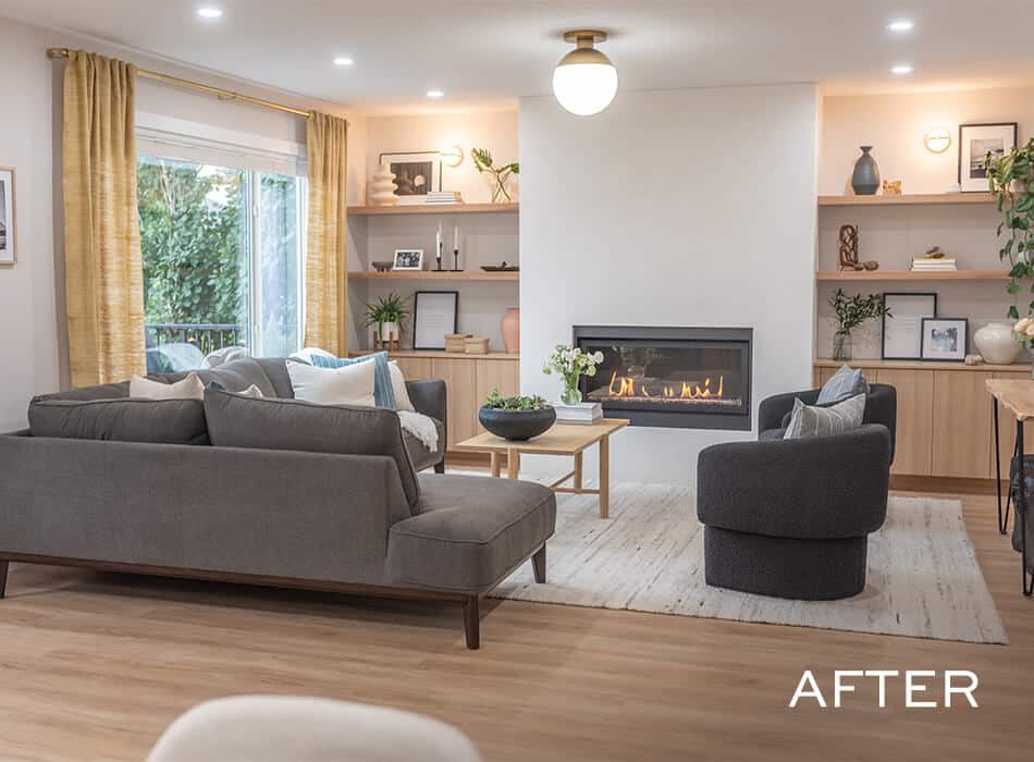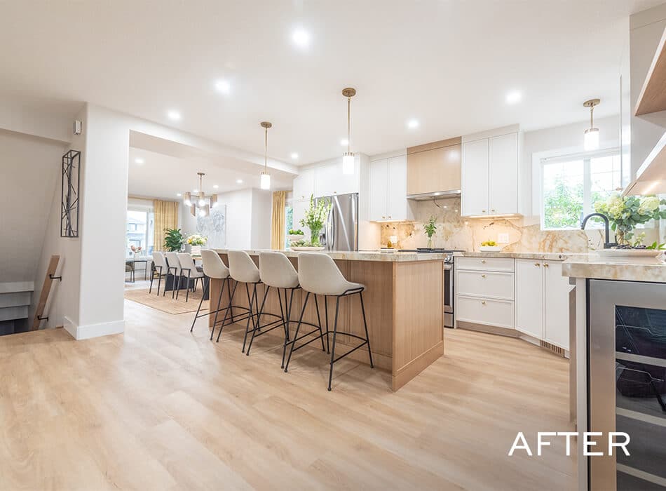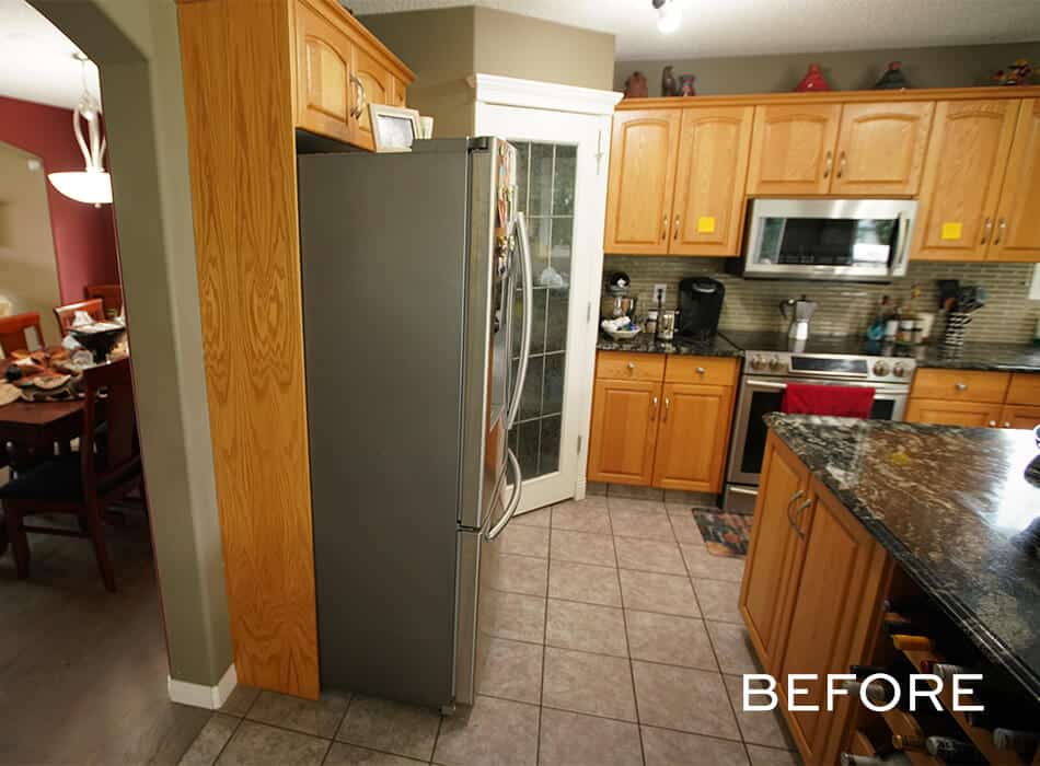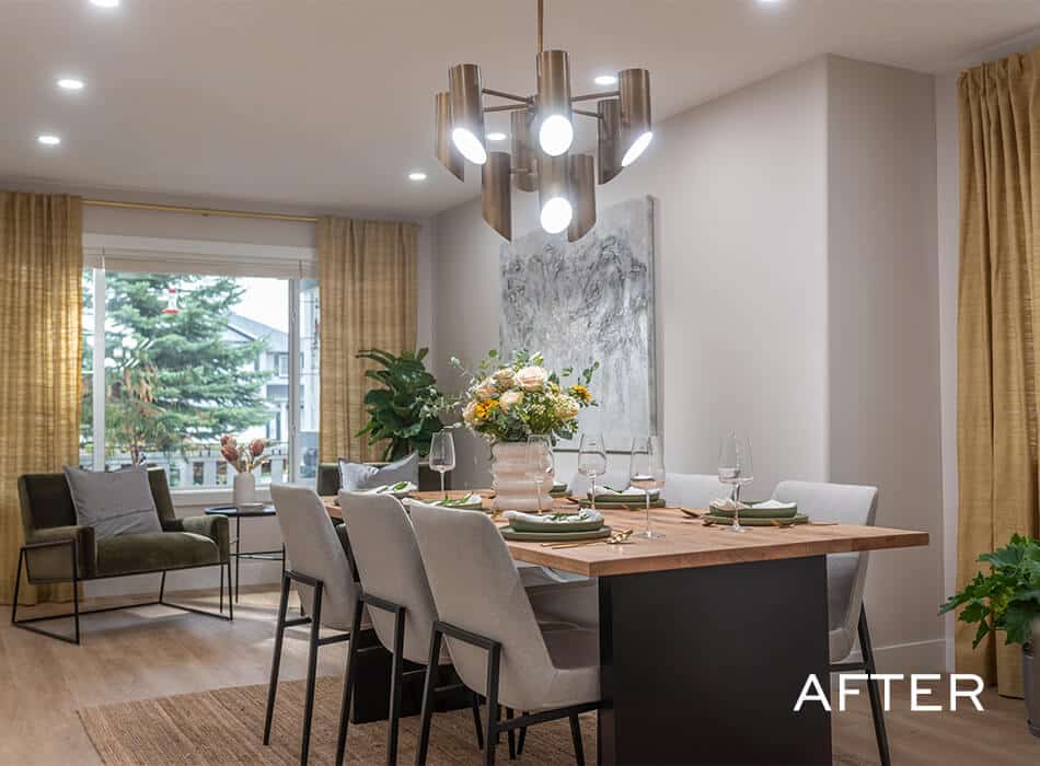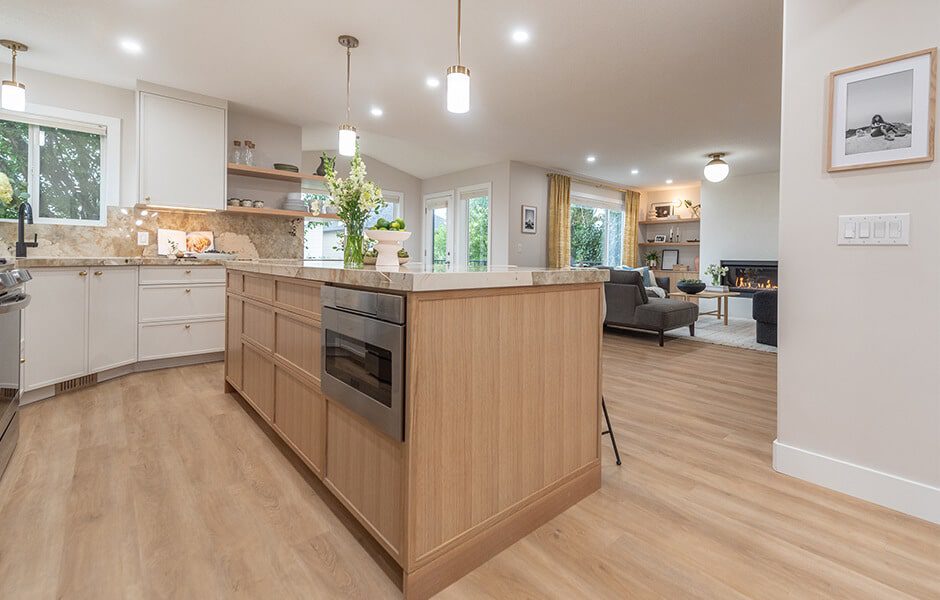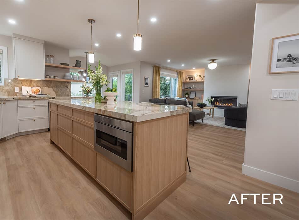 Bob and Reiki-master Denise had made many happy memories in their suburban home, and they had no intention of ever leaving. The home had a great layout, a large yard with a beautiful garden, and a cherry tree. But the house’s dated oak finishes, cluttered areas, and choppy layout were weighing on the couple. They needed help revamping their home to make it a space with positive energy and flow. We redesigned the front entry, living room, dining room, and kitchen to create a balanced, calming environment in which Bob and Denise can continue to make happy memories.