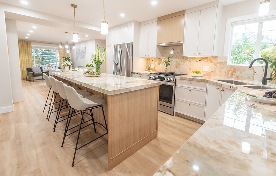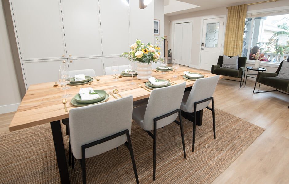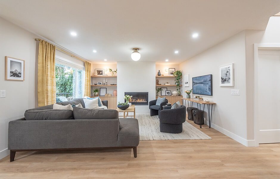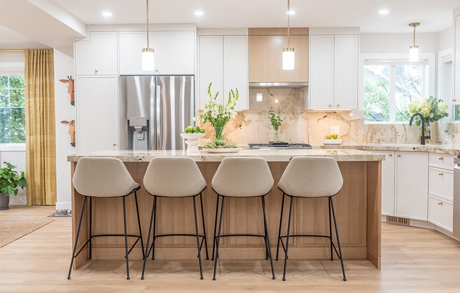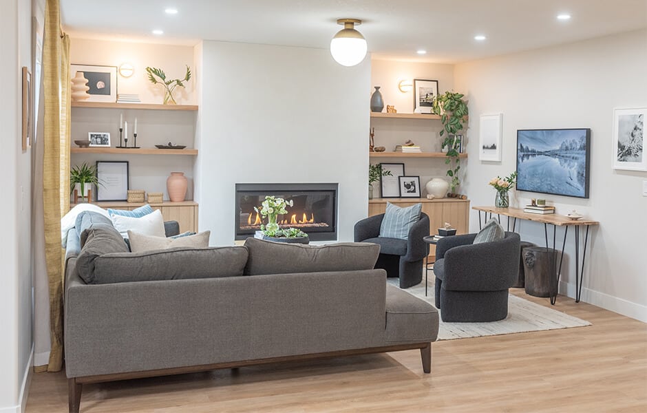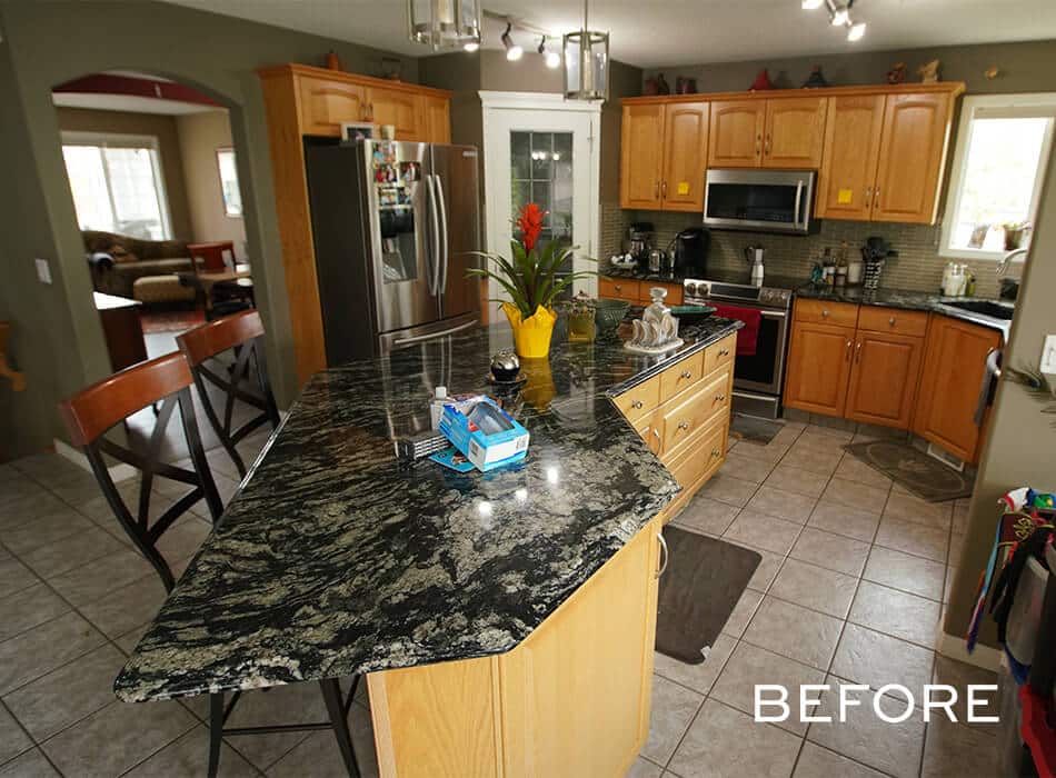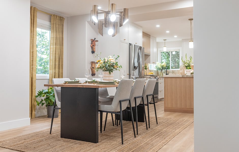 Bob and Reiki-master Denise had made many happy memories in their suburban home, and they had no intention of ever leaving. The home had a great layout, a large yard with a beautiful garden, and a cherry tree. But the house’s dated oak finishes, cluttered areas, and choppy layout were weighing on the couple. They needed help revamping their home to make it a space with positive energy and flow. We redesigned the front entry, living room, dining room, and kitchen to create a balanced, calming environment in which Bob and Denise can continue to make happy memories.