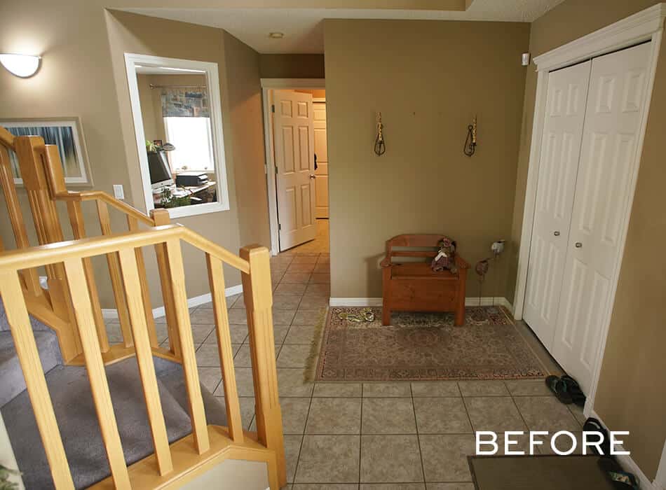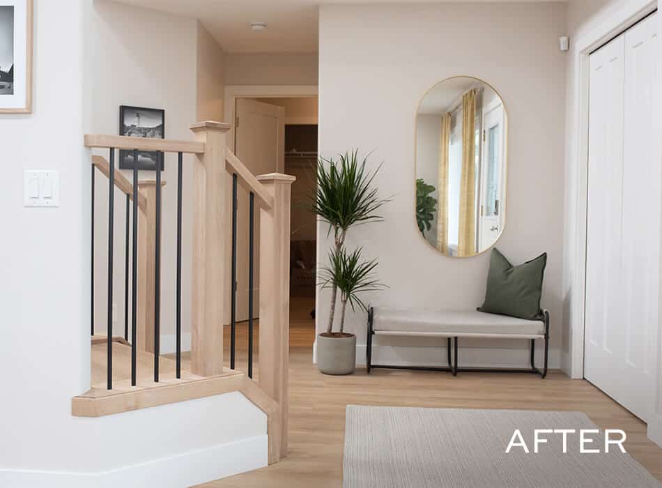 Denise and Bob’s entrance had amazing height, but was held back by its carpeted, orange-oak staircase. We replaced that dated look with black spindles and wooden treads; plus, we also switched out the lighting fixture so that dead bugs are less likely to get caught in it and dampen the entrance’s bright, refreshing energy.