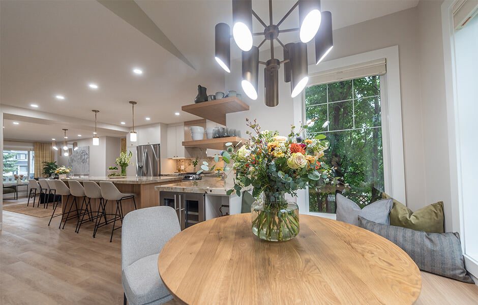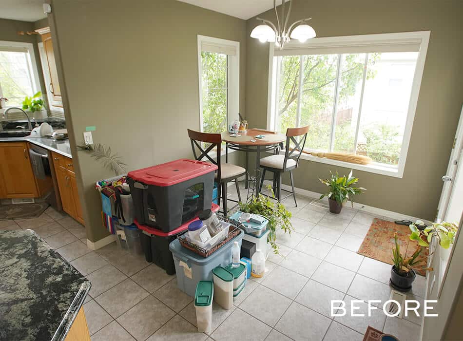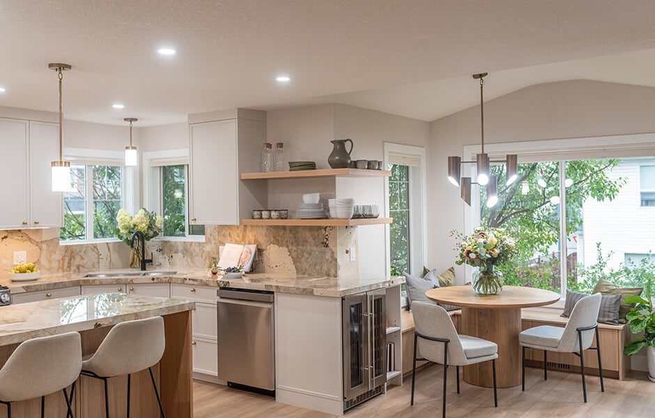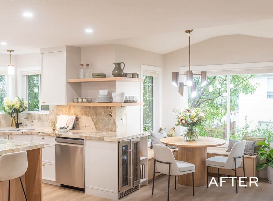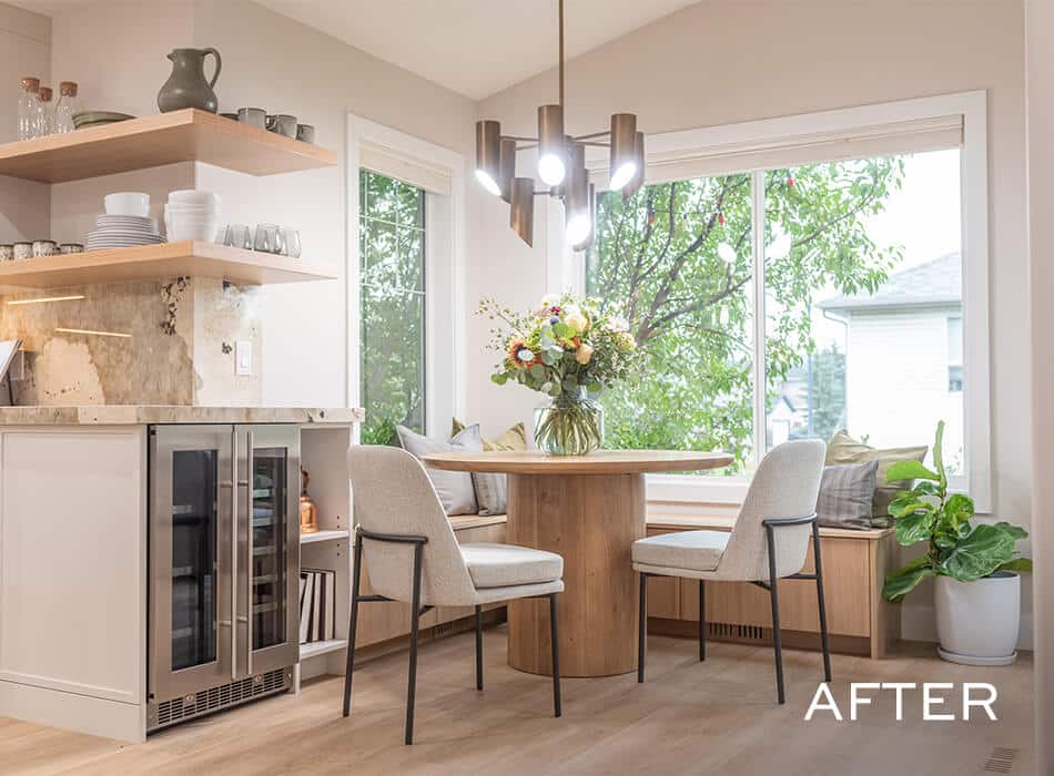Despite having a good amount of space, an awkward island shape and unintuitive appliance layout made the kitchen a, “zone of chaos,” according to Bob. By removing the dividing wall between the kitchen and dining room, we were able to install a more suitable island and turn a previously cluttered corner into a sunny breakfast nook.
