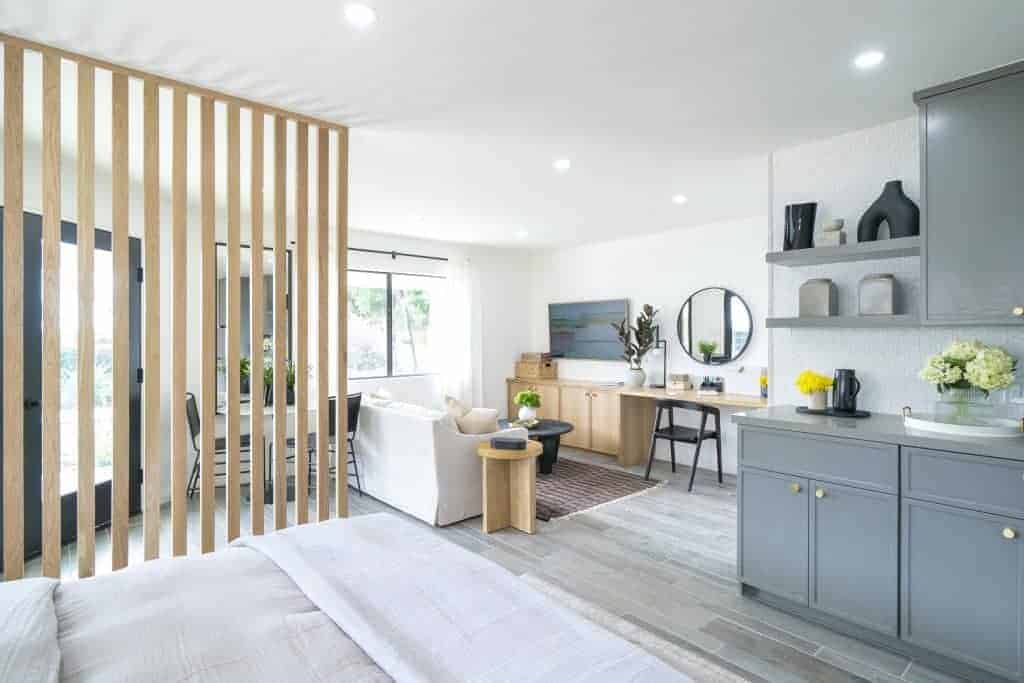Since Hillary works from home, she needed a place where she could focus without getting distracted by the rest of the family. We transformed the pool house into a flex space that can operate as a home office during the week and a guest room when grandparents want to visit.