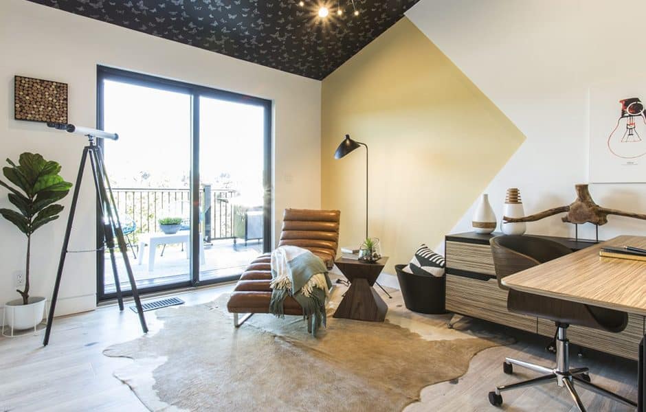 You’ve heard of “a fly on the wall,” but what about “butterflies on the ceiling”? I can’t think of a cooler way to add interest to a home office than with quirky wallpaper hanging over your head. Wait, maybe I can: a custom yellow wall niche that’s even edgier than the one in my master bedroom. Check out the shape—I literally made a great point.