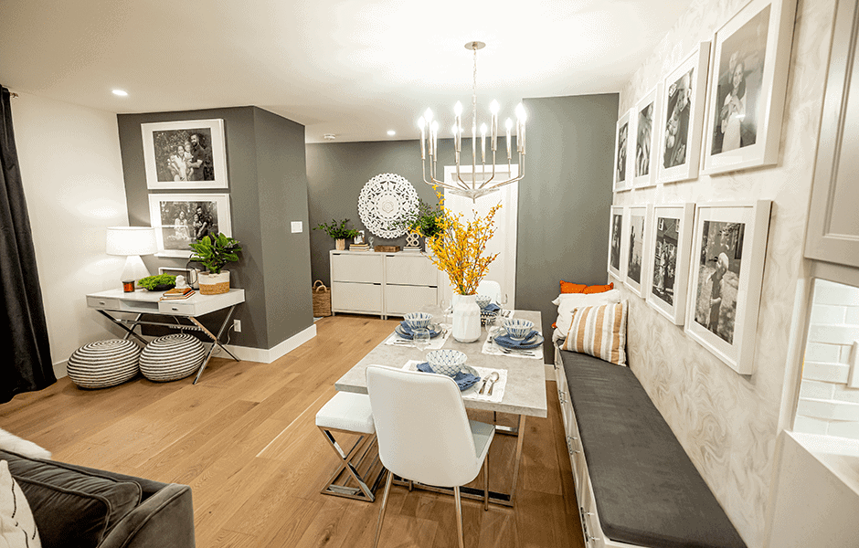 A lot of times, we’re clearing out walls and opening up the whole house. This time, we took a little detour, thanks to Irina and Dean’s newest little addition: two-month-old Adalynn, who needed a room of her own. So, instead of taking walls down, we put them up, right where the dining room table used to be. But those walls did double-duty for us, as we were able to turn the other sides into a gallery wall and banquette for the new dining room table, as well as the critical wall for the galley kitchen. And, as a bonus, we were able to take out an uneven floor that was not only a trip hazard, but really harshed the vibes during family dance parties.