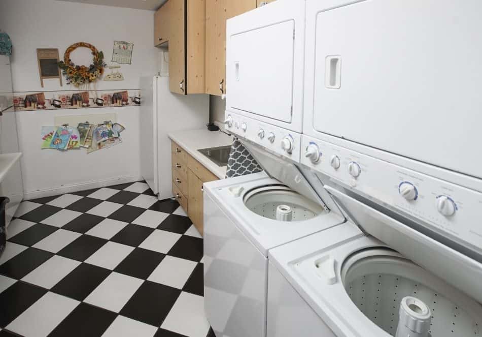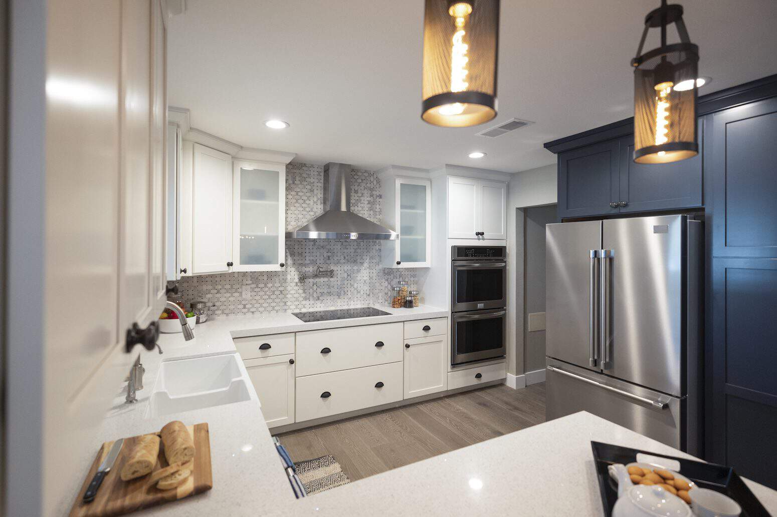 We extended the kitchen about four feet to add more countertop space and make the overall space larger. When it came time to choose design materials, we opted for a softer palette: a durable white quartz countertop with a dramatic finish—up close, it almost sparkles!—and a white and gray textured marble backsplash. To bring the farmhouse feel to life, we installed an apron sink, seen above, and a pot filler over the stove.