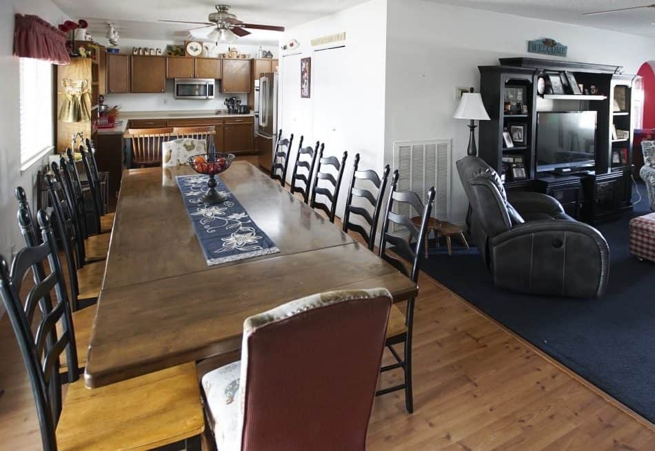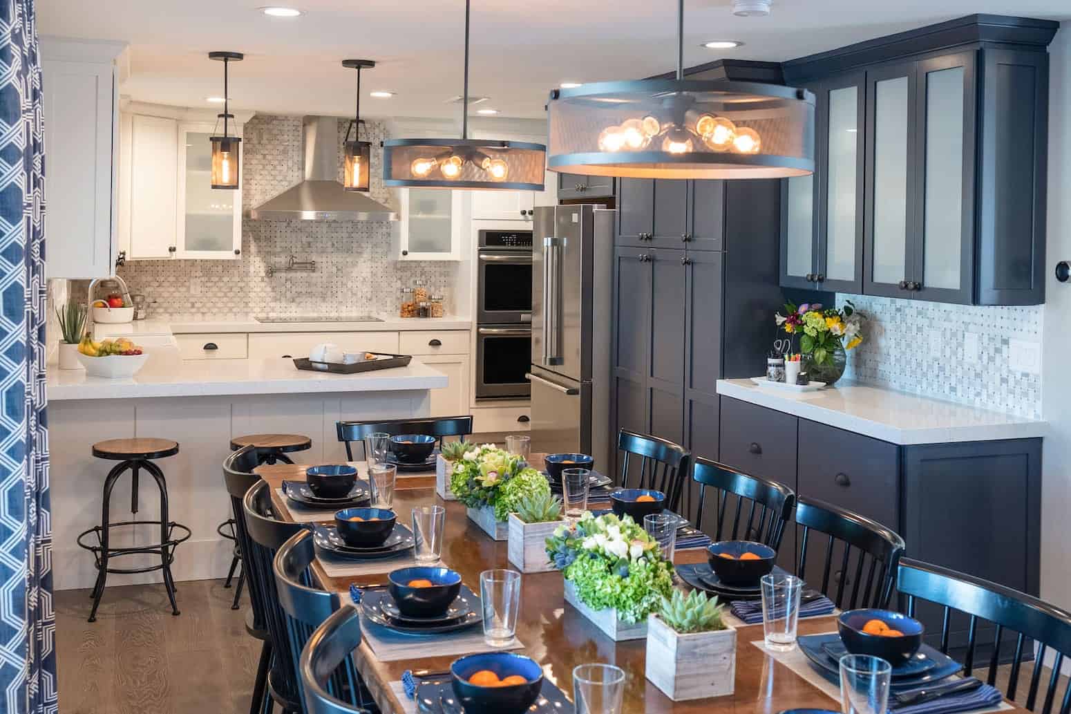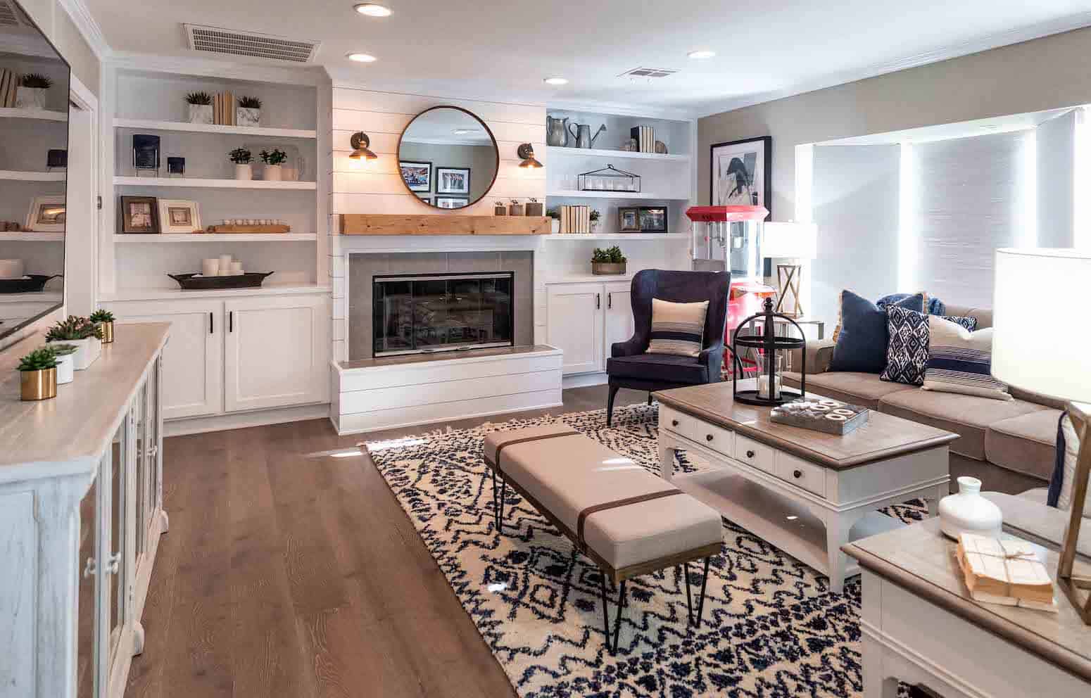 It’s no surprise that James and Crystal want to stay in their charming single-story home rather than moving: In the 17 years they’ve lived there, they’ve raised 30 kids and made countless memories. But in order to function for this special family, the house needed a lot more space, style, and storage. With the couple’s approval, we created a stunning new kitchen, a dining space for 12, and two separate entertaining areas. And throughout the home, we made sure to incorporate kid-friendly decor, like a graphic rug in the living room to hide potential stains and custom shelving for toys and picture frames. Keep reading for an inside look at three of our favorite design details from this farmhouse-chic renovation.