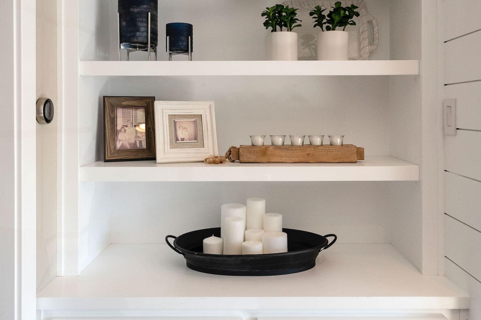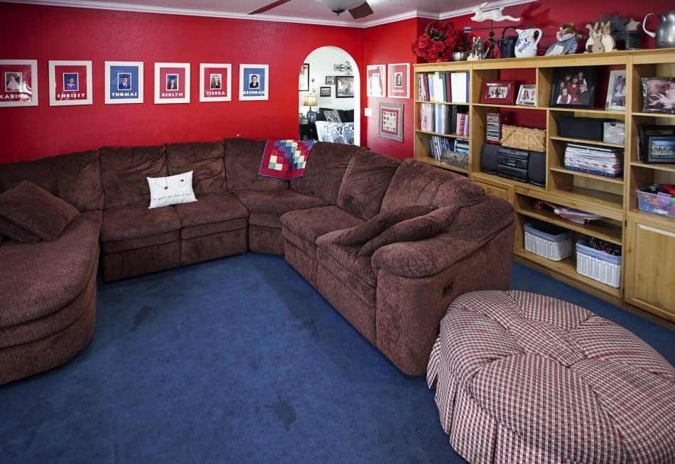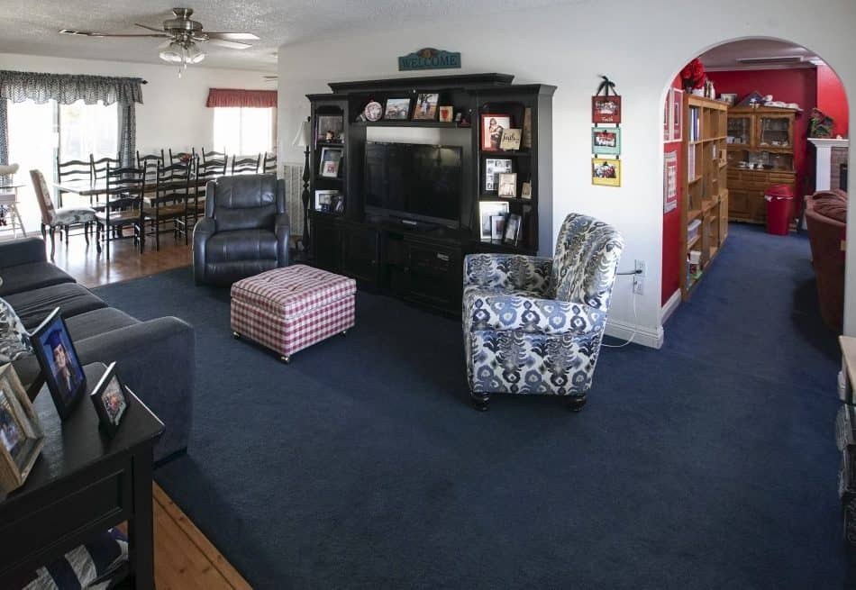 With ten-plus occupants, this home naturally contains a lot of stuff. We added two custom built-ins in the media room, with both shelving (to display books and mementos) and cupboards (to tuck other items out of sight). On the perpendicular wall, we brought in an oversize media hutch with shelves and doors for bonus storage space. And we couldn’t resist transforming the existing fireplace into a focal point with some shiplap, accent lighting, and a custom wood mantel.