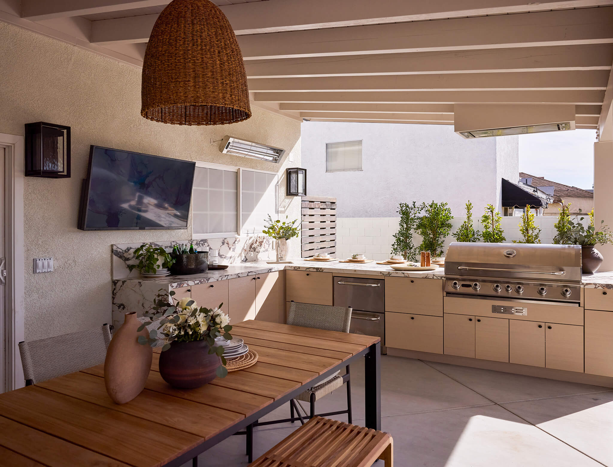 Made of a marine-grade composite, the outdoor kitchen cabinets imitate a white oak that looks as beautiful as it performs. It can handle the elements, and it beautifully complements the stone countertop. A large grill and all the kitchen accessories she could dream of make this the perfect space for cooking and hosting parties for her family.
